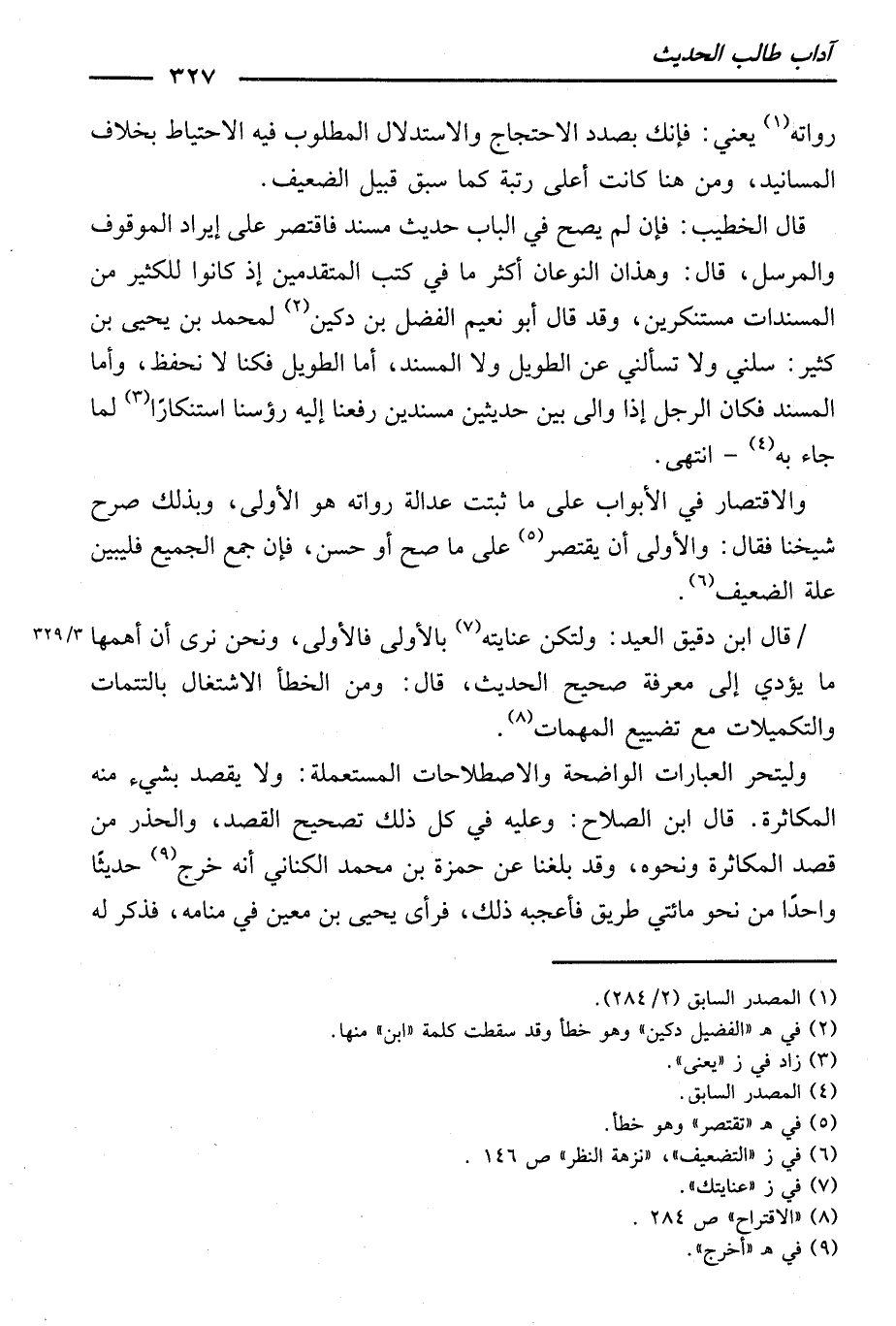 وَلْيَتَحَرَّ الْعِبَارَاتِ الْوَاضِحَةَ وَالِاصْطِلَاحَاتِ الْمُسْتَعْمَلَةَ، وَلَا يَقْصِدْ بِشَيْءٍ مِنْهُ الْمُكَاثَرَةَ. قَالَ ابْنُ الصَّلَاحِ: وَعَلَيْهِ فِي كُلِّ ذَلِكَ تَصْحِيحُ الْقَصْدِ، وَالْحَذَرُ مِنْ قَصْدِ الْمُكَاثَرَةِ وَنَحْوِهِ، وَقَدْ بَلَغَنَا عَنْ حَمْزَةَ بْنِ مُحَمَّدٍ الْكِنَانِيِّ أَنَّهُ خَرَّجَ حَدِيثًا وَاحِدًا مِنْ نَحْوِ مِائَتَيْ طَرِيقٍ، فَأَعْجَبَهُ ذَلِكَ، فَرَأَى يَحْيَى بْنَ مَعِينٍ فِي مَنَامِهِ، فَذَكَرَ لَهُ