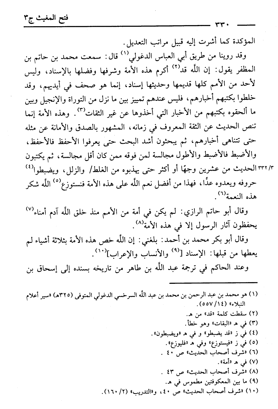 وَهَذِهِ الْأُمَّةُ إِنَّمَا تَنُصُّ الْحَدِيثَ عَنِ الثِّقَةِ الْمَعْرُوفِ فِي زَمَانِهِ الْمَشْهُورِ بِالصِّدْقِ وَالْأَمَانَةِ عَنْ مِثْلِهِ، حَتَّى تَتَنَاهَى أَخْبَارُهُمْ، ثُمَّ يَبْحَثُونَ أَشَدَّ الْبَحْثِ حَتَّى يَعْرِفُوا الْأَحْفَظَ فَالْأَحْفَظَ، وَالْأَضْبَطَ فَالْأَضْبَطَ، وَالْأَطْوَلَ مُجَالَسَةً لِمَنْ فَوْقَهُ مِمَّنْ كَانَ أَقَلَّ مُجَالَسَةً، ثُمَّ يَكْتُبُونَ الْحَدِيثَ مِنْ عِشْرِينَ وَجْهًا أَوْ أَكْثَرَ حَتَّى يُهَذِّبُوهُ مِنَ الْغَلَطِ وَالزَّلَلِ، وَيَضْبِطُوا حُرُوفَهُ، وَيَعُدُّوهُ عَدًّا، فَهَذَا مِنْ أَفْضَلِ نِعَمِ اللَّهِ عَلَى هَذِهِ الْأُمَّةِ، فَنَسْتَوْزِعُ اللَّهَ شُكْرَ هَذِهِ النِّعْمَةِ.