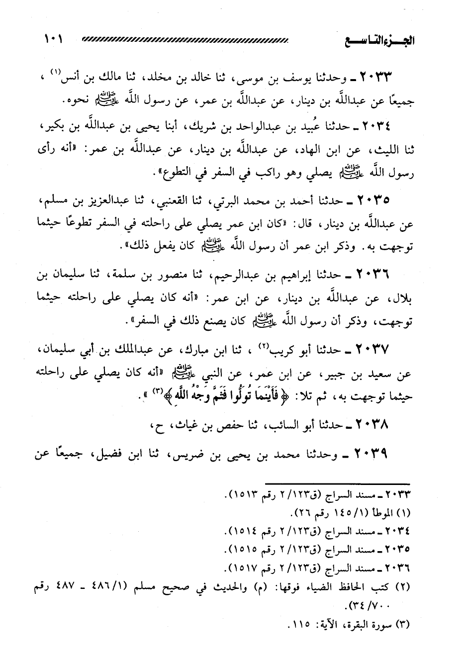 2037- حَدَّثَنَا أَبُو كُرَيْبٍ، ثنا ابْنُ الْمُبَارَكِ، عَنْ عبد الملك بن أبي سليمان، عن سعيد بْنِ جُبَيْرٍ، عَنِ ابْنِ عُمَرَ، عَنِ النَّبِيِّ صَلَّى اللَّهُ عَلَيْهِ وَسَلَّمَ ((أَنَّهُ كَانَ يُصَلِّي عَلَى رَاحِلَتِهِ حَيْثُمَا تَوَجَّهَتْ بِهِ، ثُمَّ تَلا: {فَأَيْنَمَا تُوَلُّوا فَثَمَّ وَجْهُ اللَّهِ} )) .