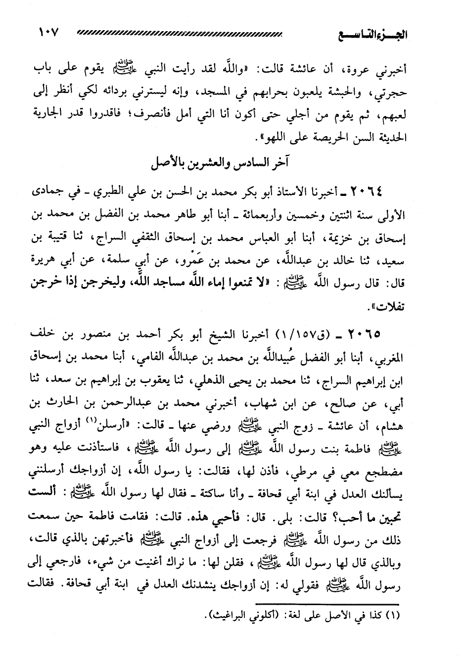 2065- أخبرنا الشيخ أَبُو بَكْرٍ أَحْمَدُ بْنُ مَنْصُورِ بْنِ خَلَفٍ المغربي، أبنا أبو الفضل عبيد الله بن محمد بن عبد الله الفامي، أبنا محمد بن إسحاق ابن إِبْرَاهِيمَ السَّرَّاجُ، ثنا مُحَمَّدُ بْنُ يَحْيَى الذُّهْلِيُّ، ثنا يعقوب بن إبراهيم بن سعد، ثنا أبي، عن صالح، عن ابن شهاب، أخبرني مُحَمَّدُ بْنُ عَبْدِ الرَّحْمَنِ بْنِ الْحَارِثِ بْنِ هِشَامٍ، أَنَّ عَائِشَةَ -زَوْجَ النَّبِيِّ صَلَّى اللَّهُ عَلَيْهِ وَسَلَّمَ وَرَضِيَ عَنْهَا- قَالَتْ: ((أَرْسَلْنَ أَزْوَاجُ النَّبِيِّ صَلَّى اللَّهُ عَلَيْهِ وَسَلَّمَ فَاطِمَةَ بِنْتَ رسول الله صلى الله عليه وسلم إلى رَسُولِ اللَّهِ صَلَّى اللَّهُ عَلَيْهِ وَسَلَّمَ، فَاسْتَأْذَنَتْ عَلَيْهِ وَهُوَ مُضْطَجِعٌ مَعِي فِي مِرْطِي، فَأَذِنَ لَهَا، فَقَالَتْ: يَا رَسُولَ اللَّهِ، إِنَّ أَزْوَاجَكَ أَرْسَلْنَنِي يَسْأَلْنَكَ الْعَدْلَ فِي ابْنَةِ أَبِي قُحَافَةَ -وَأَنَا سَاكِتَةٌ- فَقَالَ لَهَا رَسُولُ اللَّهِ صَلَّى اللَّهُ عَلَيْهِ وَسَلَّمَ: أَلَسْتِ تُحِبِّينَ مَا أُحِبُّ؟ قَالَتْ: بَلَى. قَالَ: فَأَحِبِّي هَذِهِ. قَالَتْ: فَقَامَتْ فَاطِمَةُ حِينَ سَمِعَتْ ذَلِكَ مِنْ رَسُولِ اللَّهِ صَلَّى اللَّهُ عَلَيْهِ وَسَلَّمَ فَرَجَعَتْ إِلَى أَزْوَاجِ النَّبِيِّ صَلَّى اللَّهُ عَلَيْهِ وَسَلَّمَ فَأَخْبَرَتْهُنَّ بِالَّذِي قَالَتْ، وَبِالَّذِي قَالَ لَهَا رَسُولُ اللَّهِ صَلَّى اللَّهُ عَلَيْهِ وَسَلَّمَ، فَقُلْنَ لَهَا: مَا نَرَاكِ أَغْنَيْتِ مِنْ شَيْءٍ، فَارْجِعِي إِلَى رَسُولِ اللَّهِ صَلَّى اللَّهُ عَلَيْهِ وَسَلَّمَ فَقُولِي لَهُ: إِنَّ أَزْوَاجَكَ يَنْشِدْنَكَ الْعَدْلَ فِي ابْنَةِ أَبِي قُحَافَةَ. فَقَالَتْ -[108]- فَاطِمَةُ، وَاللَّهِ لا أُكَلِّمُهُ فِيهَا أَبَدًا. قَالَتْ عَائِشَةُ: فَأَرْسَلْنَ أَزْوَاجُ النَّبِيِّ صَلَّى اللَّهُ عليه وسلم زينب بنت جحش زوج رسول الله صلى الله عليه وسلم وهي الَّتِي كَانَتْ تُسَامِينِي مِنْهُنَّ فِي الْمَنْزِلِ عِنْدَ رَسُولِ اللَّهِ صَلَّى اللَّهُ عَلَيْهِ وَسَلَّمَ، وَلَمْ أَرَ امْرَأَةً قَطُّ خَيْرًا فِي الدِّينِ مِنْ زَيْنَبَ، وَأَتْقَى للَّهِ وَأَصْدَقَ حَدِيثًا، وَأَوْصَلَ لِلرَّحِمِ، وَأَعْظَمَ صَدَقَةً، وَأَشَدَّ ابْتِذَالا لِنَفْسِهَا فِي الْعَمَلِ الَّذِي تَصَدَّقُ بِهِ وَتَقَرَّبُ بِهِ إِلَى اللَّهِ -عَزَّ وَجَلَّ- مَا عَدَا سَوْرَةً مِنْ حِدَّةٍ كَانَتْ فِيهَا، تُسْرِعُ مِنْهَا الْفَيْئَةَ. قَالَتْ: فَاسْتَأْذَنَتْ على رسول الله ورسول الله صلى الله عليه وسلم في مِرْطِهَا عَلَى الْحَالِ الَّتِي دَخَلَتْ فَاطِمَةُ وَهُوَ بِهَا، فَأَذِنَ لَهَا رَسُولُ اللَّهِ صَلَّى اللَّهُ عليه وسلم فقالت: يا رسول الله، إن أَزْوَاجَكَ أَرْسَلْنَنِي يَسْأَلْنَكَ الْعَدْلَ فِي ابْنَةِ أَبِي قحافة. قالت: ثم وقعت فَاسْتَطَالَتْ عَلَيَّ، وَأَنَا أَرْقُبُ رَسُولَ اللَّهِ صَلَّى اللَّهُ عَلَيْهِ وَسَلَّمَ وَأَرْقُبُ طَرْفَهُ، هَلْ يَأْذَنُ لِي فِيهَا. قَالَتْ: فَلَمْ تَبْرَحْ حَتَّى عَرَفْتُ أن رسول الله صلى الله عليه وسلم لا يكره أن أنتصر. قالت: فلما (سمعت) وقعت بها لم أنشبها حين أَنْحَيْتُ. قَالَتْ: قَالَ رَسُولُ اللَّهِ صَلَّى اللَّهُ عَلَيْهِ وَسَلَّمَ وَتَبَسَّمَ: إِنَّهَا لابْنَةُ أَبِي بَكْرٍ)) .
