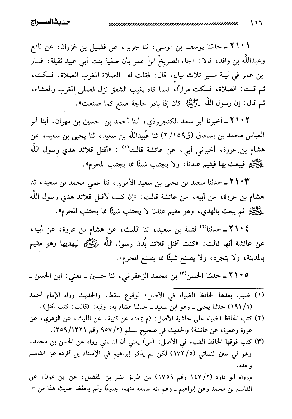 2101- حدثنا يوسف بن موسى، ثنا جرير، عن فُضَيْلِ بْنِ غَزْوَانَ، عَنْ نَافِعٍ وَعَبْدِ اللَّهِ بْنِ وَاقِدٍ، قَالا: ((جَاءَ الصَّرِيخُ ابْنُ عُمَرَ بِأَنَّ صَفِيَّةَ بِنْتَ أَبِي عُبَيْدٍ ثَقِيلَةٌ، فَسَارَ ابْنُ عُمَرَ في ليلة مَسِيرَ ثَلاثِ ليالٍ، قَالَ: فَقُلْتُ لَهُ: الصَّلاةُ الْمَغْرِبُ الصَّلاةُ. فَسَكَتَ، ثُمَّ قُلْتُ: الصَّلاةُ، فَسَكَتَ مِرَارًا، فَلَمَّا كَادَ يغيب الشفق نزل فصلى المغرب والعشاء، ثم قال: إن رسول الله صلى الله عليه وَسَلَّمَ كَانَ إِذَا بَادَرَ حَاجَةً صَنَعَ كَمَا صنعت)) .