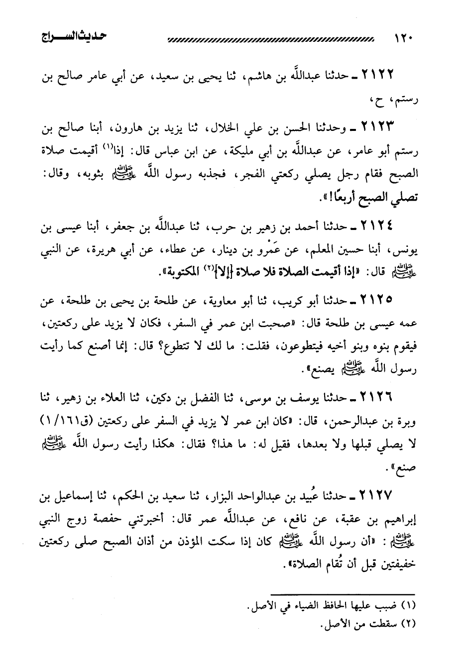 2125- حَدَّثَنَا أَبُو كُرَيْبٍ، ثنا أَبُو مُعَاوِيَةَ، عَنْ طَلْحَةَ بْنِ يَحْيَى بْنِ طَلْحَةَ، عَنْ عَمِّهِ عِيسَى بْنِ طَلحَةَ قَالَ: ((صَحِبْتُ ابْنَ عُمَرَ فِي السَّفَرِ، فَكَانَ لا يَزِيدُ عَلَى رَكْعَتَيْنِ، فيقوم بنوه وبنو أخيه فيتطوعون فقلت: ما لك لا تَتَطَوَّعُ؟ قَالَ: إِنَّمَا أَصْنَعُ كَمَا رَأَيْتُ رسول الله صلى الله عليه وسلم يصنع)) .