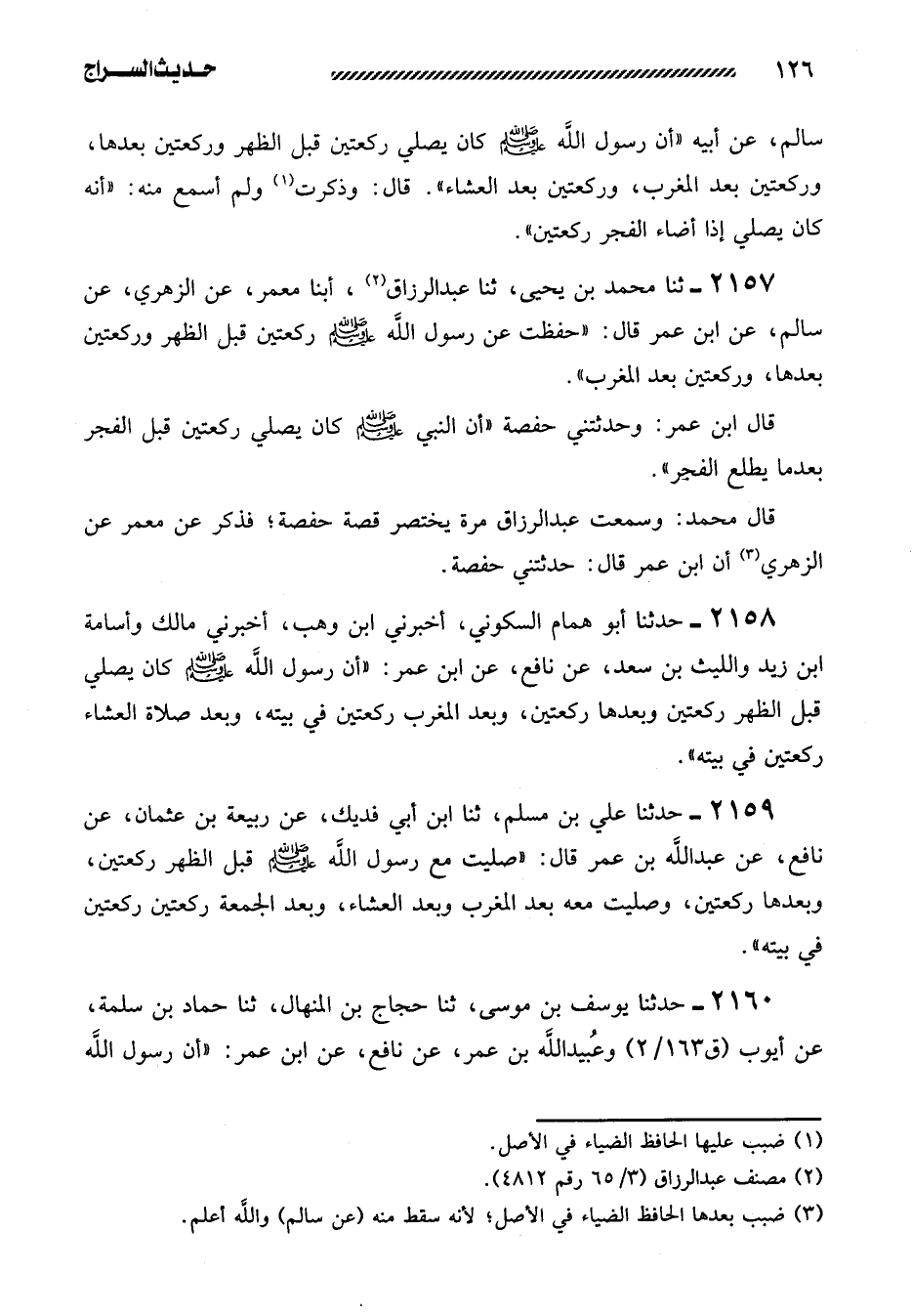 2157- ثنا محمد بن يحيى، ثنا عبد الرزاق، أبنا مَعْمَرٌ، عَنِ الزُّهْرِيِّ، عَنْ سَالِمٍ، عَنِ ابْنِ عمر قال: ((حفظت عن رسول الله صلى اللَّهُ عَلَيْهِ وَسَلَّمَ رَكْعَتَيْنِ قبل الظهر وَرَكْعَتَيْنِ بَعْدَهَا، وركعتين بعد المغرب)) .