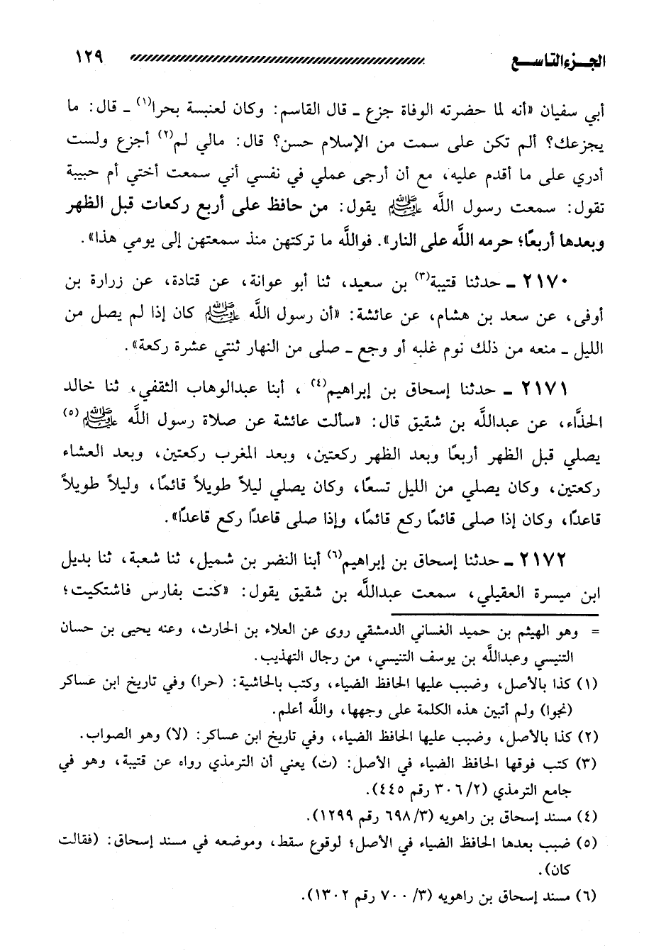 2171- حدثنا إسحاق بن إبراهيم، أبنا عبد الوهاب الثقفي، ثنا خالد الحذاء، عن عَبْدِ اللَّهِ بْنِ شَقِيقٍ قَالَ: ((سَأَلْتُ عَائِشَةَ عن صلاة رسول الله صلى الله عليه وَسَلَّمَ يُصَلِّي قَبْلَ الظُّهْرِ أَرْبَعًا وَبَعْدَ الظُّهْرِ رَكْعَتَيْنِ، وَبَعْدَ الْمَغْرِبِ رَكْعَتَيْنِ، وَبَعْدَ الْعِشَاءِ رَكْعَتَيْنِ، وَكَانَ يُصَلِّي مِنَ اللَّيْلِ تِسْعًا، وَكَانَ يُصَلِّي لَيْلا طَوِيلا قَائِمًا، وَلَيْلا طَوِيلا قَاعِدًا، وَكَانَ إِذَا صَلَّى قَائِمًا رَكَعَ قَائِمًا، وَإِذَا صَلَّى قَاعِدًا رَكَعَ قَاعِدًا)) .