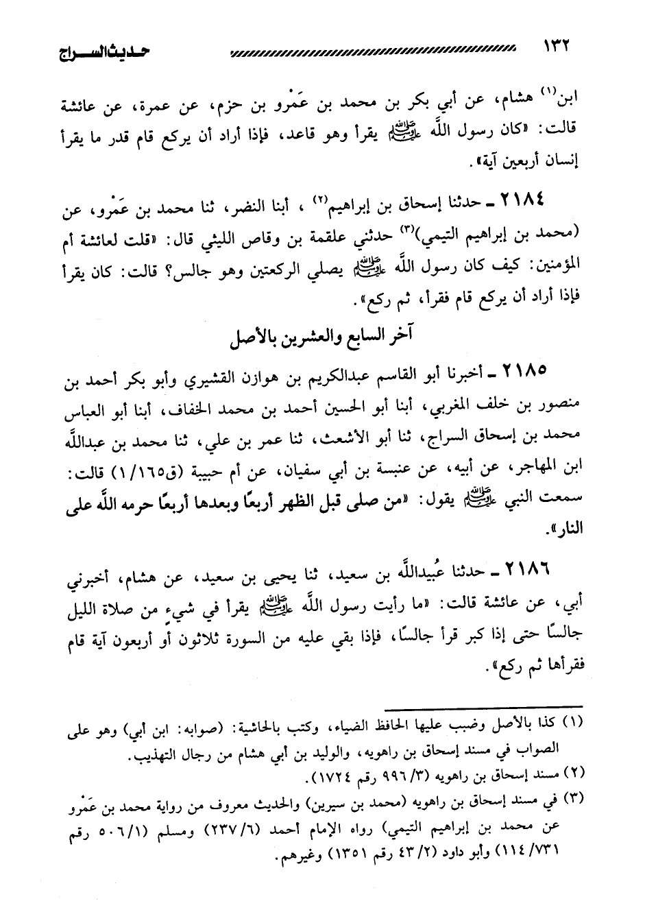 2185- أَخْبَرَنَا أَبُو الْقَاسِمِ عَبْدُ الْكَرِيمِ بْنُ هَوَازِنَ الْقُشَيْرِيُّ وَأَبُو بَكْرٍ أَحْمَدُ بْنُ مَنْصُورِ بْنِ خلف المغربي، أبنا أبو الحسين أحمد بن محمد الخفاف، أبنا أَبُو الْعَبَّاسِ مُحَمَّدُ بْنُ إِسْحَاقَ السَّرَّاجُ، ثنا أَبُو الأَشْعَثِ، ثنا عُمَرُ بْنُ عَلِيٍّ، ثنا محمد بن عبد الله ابن الْمُهَاجِرِ، عَنْ أَبِيهِ، عَنْ عَنْبَسَةَ بْنِ أَبِي سُفْيَانَ، عَنْ أُمِّ حَبِيبَةَ قَالَتْ: سَمِعْتُ النَّبِيَّ صلى الله عليه وسلم يقول: ((من صلى قبل الظُّهْرَ أَرْبَعًا وَبَعْدَهَا أَرْبَعًا حَرَّمَهُ اللَّهُ عَلَى النار)) .