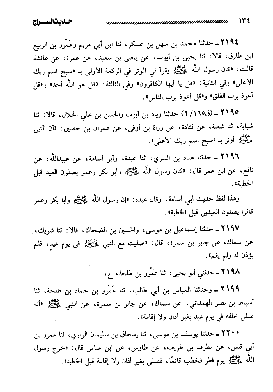 2196- حَدَّثَنَا هَنَّادُ بْنُ السَّرِيِّ، ثنا عَبْدَةُ، وَأَبُو أُسَامَةَ، عَنْ عُبَيْدِ اللَّهِ، عَنْ نَافِعٍ، عَنِ ابن عمر قال: ((كان رسول الله صلى اللَّهُ عَلَيْهِ وَسَلَّمَ وَأَبُو بَكْرٍ وَعُمَرُ يُصَلُّونَ الْعِيدَ قَبْلَ الْخُطْبَةِ)) .