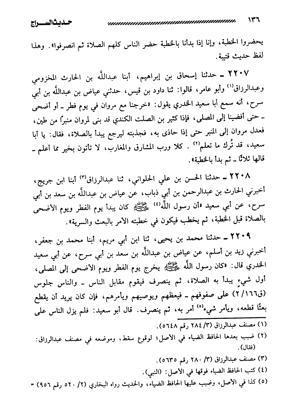 2207- حدثنا إسحاق بن إبراهيم، أبنا عَبْدُ اللَّهِ بْنُ الْحَارِثِ الْمَخْزُومِيُّ وَعَبْدُ الرَّزَّاقِ وَأَبُو عَامِرٍ، قَالُوا: ثنا دَاوُدُ بْنُ قَيْسٍ، حَدَّثَنِي عِيَاضُ بْنُ عَبْدِ اللَّهِ بْنِ أَبِي سَرْحٍ، أَنَّهُ سَمِعَ أَبَا سَعِيدٍ الْخُدْرِيَّ يَقُولُ: ((خَرَجْنَا مَعَ مَرْوَانَ فِي يَوْمِ فِطْرٍ -أَوْ أَضْحَى- حَتَّى أَفْضَيْنَا إِلَى الْمُصَلَّى، فَإِذَا كَثِيرُ بن الصلت الكندي قد بنى لمروان منبرا مِنْ طِينٍ، فَعَدَلَ مَرْوَانُ إِلَى الْمِنْبَرِ حَتَّى إِذَا حَاذَى بِهِ، فَجَذَبْتُهُ لِيَرْجِعَ يَبْدَأُ بِالصَّلاةِ، فَقَالَ: يَا أَبَا سَعِيدٍ، قَدْ تُرِكَ مَا تعلم. كَلا وَرَبِّ الْمَشَارِقِ وَالْمَغَارِبِ، لا تَأْتُونَ بِخَيْرٍ مِمَّا أَعْلَمُ -قَالَهَا ثَلاثًا- ثُمَّ بَدَأَ بِالْخُطْبَةِ)) .
