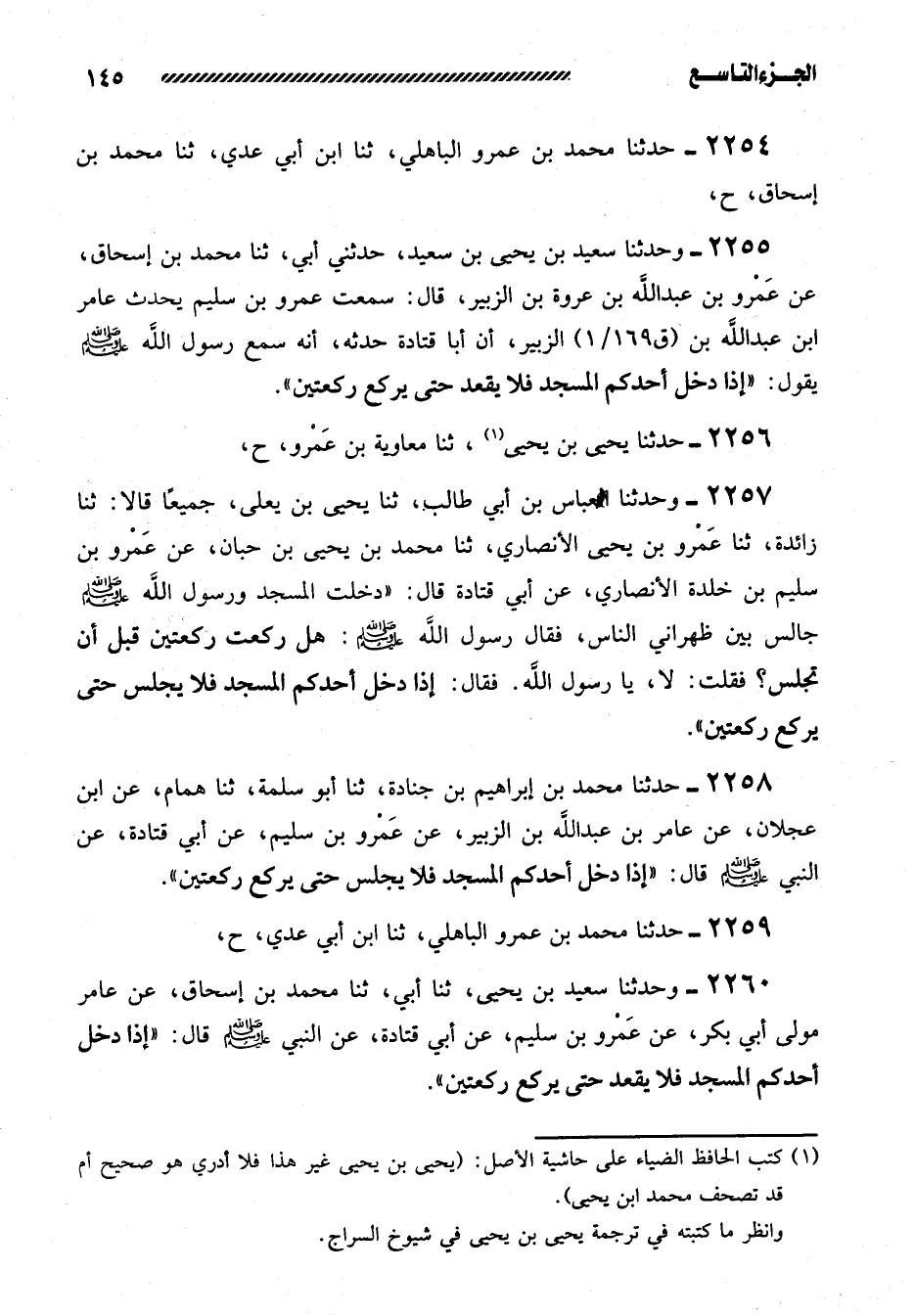 2255- وَحَدَّثَنَا سَعِيدُ بْنُ يَحْيَى بْنِ سَعِيدٍ، حَدَّثَنِي أَبِي، ثنا مُحَمَّدُ بْنُ إِسْحَاقَ، عَنْ عَمْرِو بْنِ عَبْدِ اللَّهِ بْنِ عُرْوَةَ بْنُ الزُّبَيْرِ، قَالَ: سَمِعْتُ عَمْرَو بْنَ سُلَيْمٍ يُحَدِّثُ عَامِرَ ابن عَبْدِ اللَّهِ بْنِ الزُّبَيْرِ، أَنَّ أَبَا قَتَادَةَ حدثه، أنه سمع رسول الله يَقُولُ: ((إِذَا دَخَلَ أَحَدُكُمُ الْمَسْجِدَ فَلا يَقْعُدْ حَتَّى يَرْكَعَ رَكْعَتَيْنِ)) .