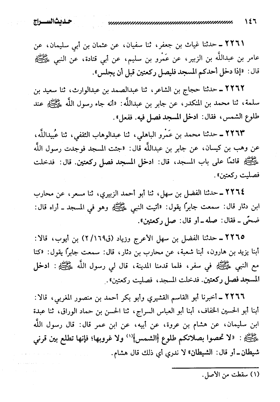 2266- أَخْبَرَنَا أَبُو الْقَاسِمِ الْقُشَيْرِيُّ وَأَبُو بَكْرٍ أَحْمَدُ بن منصور المغربي، قالا: أبنا أبو الحسين الخفاف، أبنا أبو العباس السراج، ثنا الحسن بن حماد الوراق، ثنا عبدة ابن سُلَيْمَانَ، عَنْ هِشَامِ بْنِ عُرْوَةَ، عَنْ أَبِيهِ، عن ابن عمر قال: قال رسول الله صلى الله عليه وسلم: ((لا تحصوا بصلاتكم طلوع [الشمس] ولا غروبها؛ فإنها تطلع بَيْنَ قَرْنَيْ شَيْطَانٍ - أَوْ قَالَ: الشَّيْطَانِ)) لا ندري أَيَّ ذَلِكَ قَالَ هِشَامٌ.