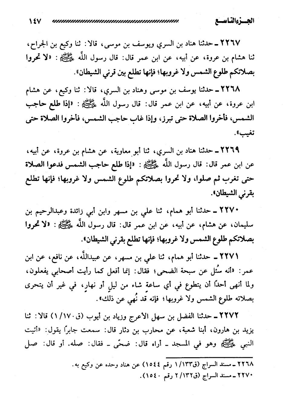 2269- حَدَّثَنَا هَنَّادُ بْنُ السَّرِيِّ، ثنا أَبُو مُعَاوِيَةَ، عن هشام بن عروة، عن أبيه، عن ابن عمر قال: قال رسول الله صلى الله عليه وسلم: ((إذا طلع حاجب الشمس فَدَعُوا الصَّلاةَ حَتَّى تَغْرُبَ ثُمَّ صَلُّوا، وَلا تحروا بصلاتكم طلوع الشمس ولا غروبها؛ فإنها تطلع بقرني الشيطان)) .