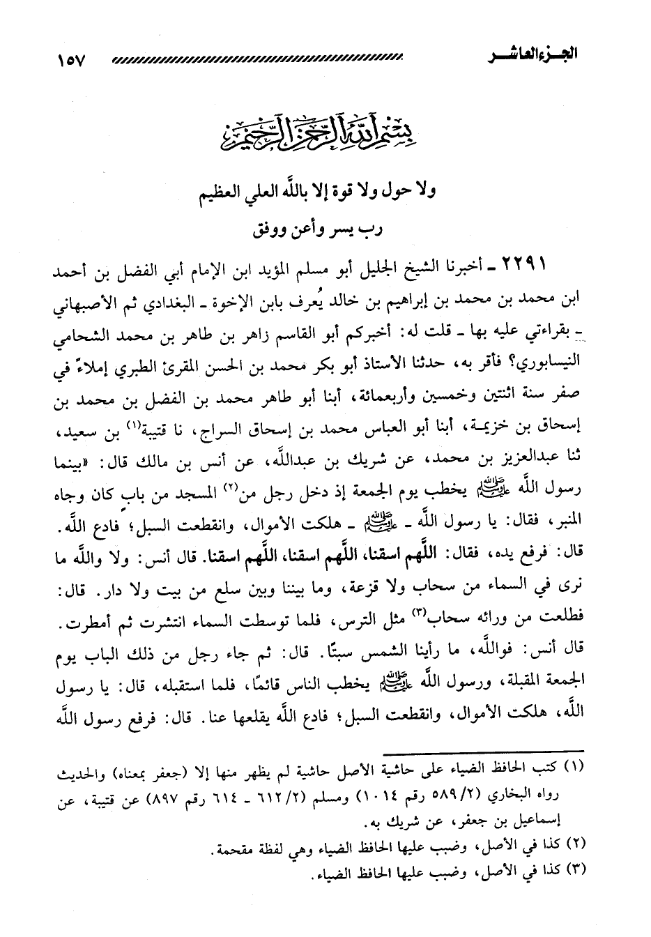 2291- أَخْبَرَنَا الشَّيْخُ الْجَلِيلُ أَبُو مُسْلِمٍ المؤيد ابن الإمام أبي الفضل بن أحمد ابن محمد بن محمد بن إبراهيم بن خالد يُعْرَفُ بِابْنِ الأخوَةِ - الْبَغْدَادِيُّ ثُمَّ الأَصْبَهَانِيُّ -بِقِرَاءَتِي عَلَيْهِ بِهَا- قُلْتُ لَهُ: أَخْبَرَكُمْ أَبُو الْقَاسِمِ زاهر بن طاهر بن محمد الشحامي النيسابوري؟ فَأَقَرَّ بِهِ، حَدَّثَنَا الأُسْتَاذُ أَبُو بَكْرٍ مُحَمَّدُ بْنُ الْحَسَنِ الْمُقْرِئُ الطَّبَرِيُّ إِمْلاءً فِي صَفَرٍ سنة اثنتين وخمسين وأربعمائة، أبنا أبو طاهر محمد بن الفضل بن محمد بن إسحاق بن خزيمة، أبنا أبو العباس محمد بن إسحاق السَّرَّاجُ، نَا قُتَيْبَةُ بْنُ سَعِيدٍ، ثَنَا عَبْدُ الْعَزِيزِ بْنُ مُحَمَّدٍ، عَنْ شَرِيكِ بْنِ عَبْدِ اللَّهِ، عَنْ أَنَسِ بْنِ مَالِكٍ قَالَ: ((بَيْنَمَا رَسُولُ اللَّهِ صَلَّى اللَّهُ عَلَيْهِ وَسَلَّمَ يَخْطُبُ يوم الجمعة إذ دخل رجل من الْمَسْجِدِ مِنْ بابٍ كَانَ وِجَاهَ الْمِنْبَرُ، فَقَالَ: يا رسول الله - صلى الله عليه وسلم - هَلَكَتِ الأَمْوَالُ، وَانْقَطَعَتِ السُّبُلُ؛ فَادْعُ اللَّهَ. قَالَ: فَرَفَعَ يَدَهُ، فَقَالَ: اللَّهُمَّ اسْقِنَا، اللَّهُمَّ اسْقِنَا، اللَّهُمَّ اسْقِنَا. قَالَ أَنَسٌ: وَلا وَاللَّهِ مَا نَرَى فِي السَّمَاءِ مِنْ سَحَابٍ وَلا قَزَعَةٍ، وَمَا بَيْنَنَا وَبَيْنَ سَلْعٍ مِنْ بَيْتٍ وَلا دَارٍ. قَالَ: فَطَلَعَتْ مِنْ وَرَائِهِ سَحَابٌ مِثْلُ التُّرْسِ، فَلَمَّا تَوَسَّطَتِ السَّمَاءَ انْتَشَرَتْ ثُمَّ أَمْطَرَتْ. قال أنس: فوالله، ما رأينا الشمس سبتاً. قَالَ: ثُمَّ جَاءَ رَجُلٌ مِنْ ذَلِكَ الْبَابِ يَوْمَ الْجُمُعَةِ الْمُقْبِلَةِ، وَرَسُولُ اللَّهِ صَلَّى اللَّهُ عَلَيْهِ وَسَلَّمَ يَخْطُبُ النَّاسَ قَائِماً، فَلَمَّا اسْتَقْبَلَهُ، قَالَ: يَا رَسُولَ اللَّهِ، هَلَكَتِ الأَمْوَالُ، وَانْقَطَعَتِ السُّبُلُ؛ فَادْعُ اللَّهَ يُقْلِعُهَا عَنَّا. قَالَ: فَرَفَعَ رَسُولُ اللَّهِ -[158]- صَلَّى اللَّهُ عَلَيْهِ وَسَلَّمَ يَدَهُ فَقَالَ: اللَّهُمَّ حَوَالَيْنَا وَلا علَيْنَا، اللَّهُمَّ عَلَى الآجام والظراب وَبُطُونِ الأَوْدِيَةِ، وَمَنَابِتِ الشَّجَرِ. قَالَ: فأَقْْلَعَتْ وَخَرَجْنَا نَمْشِي فِي الشَّمْسِ)) .
