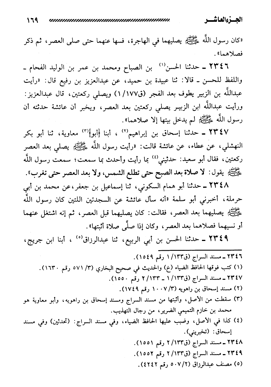 2346- حَدَّثَنَا الْحَسَنُ بْنُ الصَّبَّاحِ وَمُحَمَّدُ بْنُ عُمَرَ بْنِ الْوَلِيدِ الْفَحَّامُ -وَاللَّفْظُ لِلْحَسَنِ- قَالا: ثنا عُبَيْدَةُ بْنُ حُمَيْدٍ، عَنْ عَبْدِ الْعَزِيزِ بْنِ رَفِيعٍ قَالَ: ((رَأَيْتُ عَبْدَ اللَّهِ بْنَ الزُّبَيْرِ يَطُوفُ بَعْدَ الْفَجْرِ وَيُصَلِّي رَكْعَتَيْنِ، قَالَ عَبْدُ العزيز: ورأيت عبد الله ابن الزُّبَيْرِ يُصَلِّي رَكْعَتَيْنِ بَعْدَ الْعَصْرِ، وَيُخْبِرُ أَنَّ عَائِشَةَ حَدَّثَتْهُ أَنَّ رَسُولَ اللَّهِ صَلَّى اللَّهُ عَلَيهِ وَسَلَّمَ لَمْ يَدْخُلْ بَيْتَهَا إِلا صَلاهُمَا)) .