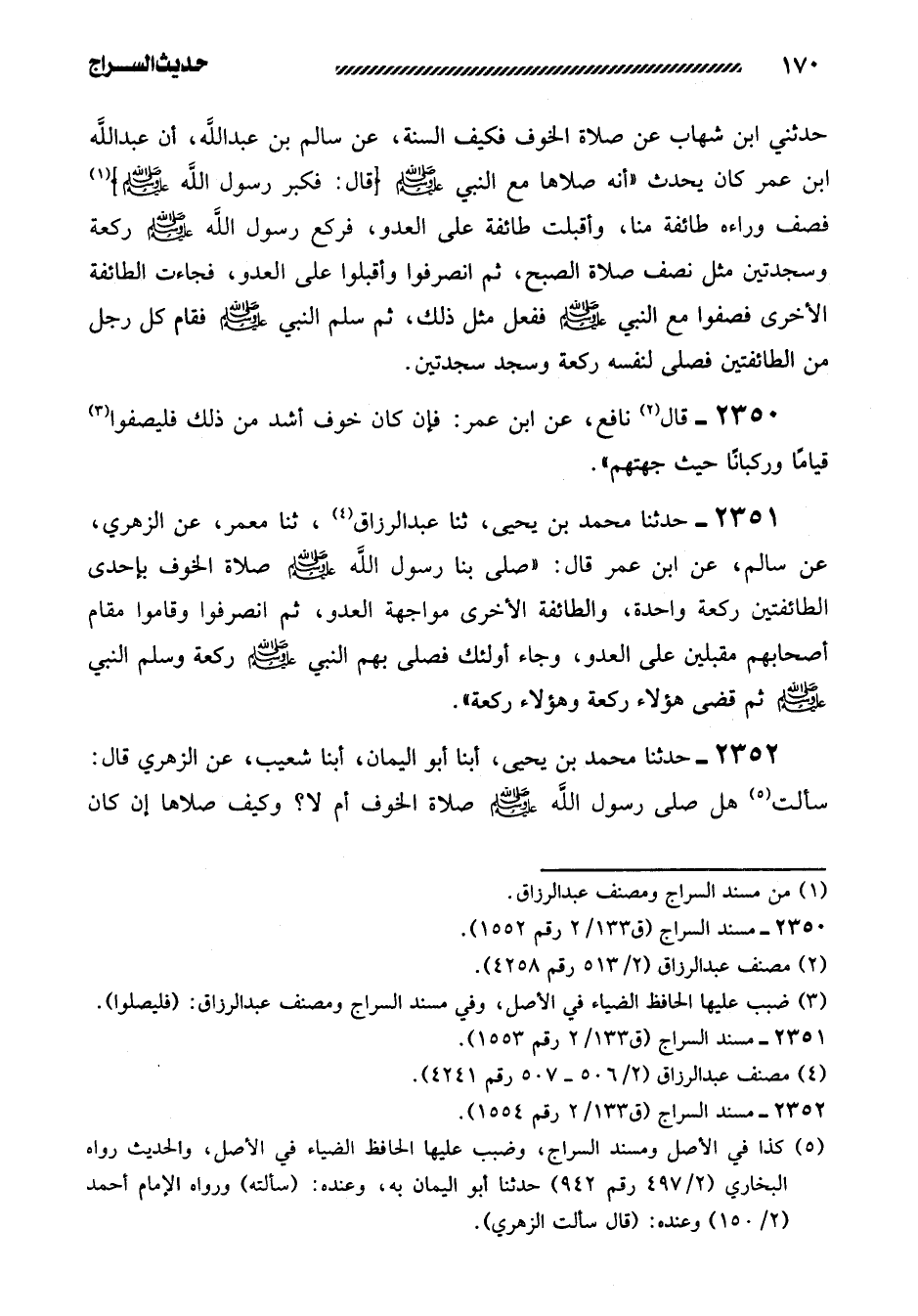 2351- حَدَّثَنَا مُحَمَّدُ بْنُ يَحْيَى، ثنا عَبْدُ الرَّزَّاقِ، ثنا مَعْمَرٌ، عَنِ الزُّهْرِيِّ، عَنْ سَالِمٍ، عَنِ ابْنِ عُمَرَ قَالَ: ((صَلَّى بِنَا رَسُولُ اللَّهِ صَلَّى اللَّهُ عَلَيْهِ وَسَلَّمَ صَلاةَ الْخَوْفِ بِإِحْدَى الطَّائِفَتَيْنِ ركعة واحدة، والطائفة الأخرى مواجهة العدو، ثم انصرفوا وقاموا مقام أصحابهم مقبلين على العدو، وجاء أولئك فصلى بِهِمُ النَّبِيُّ صَلَّى اللَّهُ عَلَيْهِ وَسَلَّمَ رَكْعَةً وسلم النَّبِيِّ صَلَّى اللَّهُ عَلَيْهِ وَسَلَّمَ ثُمَّ قَضَى هَؤُلاءِ رَكْعَةً وهَؤُلاءِ رَكْعَةً)) .