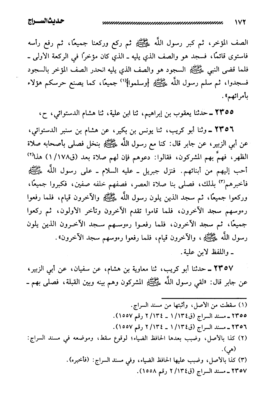 2356- وثنا أَبُو كُرَيْبٍ، ثنا يُونُسُ بْنُ بُكَيْرٍ، عَنْ هِشَامِ بْنِ سَنْبَرٍ الدَّسْتُوَائِيِّ، عَنْ أَبِي الزُّبَيْرِ، عَنْ جَابِرٍ قَالَ: كُنَّا مَعَ رَسُولِ اللَّهِ صَلَّى اللَّهُ عَلَيْهِ وَسَلَّمَ بِنَخْلٍ فَصَلَّى بِأَصْحَابِهِ صَلاةَ الظُّهْرِ، فهم بهم المشركون، فقالوا: دعهم فَإِنَّ لَهُمْ صَلاةً بَعْدَ هَذَا أَحَبَّ إِلَيْهِمْ مِنْ أَبْنَائِهِمْ. فَنَزَلَ جِبْرِيلُ -عَلَيْهِ السَّلامُ- عَلَى رَسُولِ اللَّهِ صَلَّى اللَّهُ عَلَيْهِ وَسَلَّمَ فَأَخْبَرَهُمْ بِذَلِكَ، فَصَلَّى بِنَا صَلاةَ الْعَصْرِ، فَصَفَّهُمْ خَلْفَهُ صفين، فكبروا جميعاً، وَرَكَعُوا جَمِيعًا، ثُمَّ سَجَدَ الَّذِينَ يَلُونَ رَسُولَ اللَّهِ صَلَّى اللَّهُ عَلَيْهِ وَسَلَّمَ وَالآخَرُونَ قِيَامٌ، فَلَمَّا رَفَعُوا رُءُوسَهُمْ سَجَدَ الآخَرُونَ، فَلَمَّا قَامُوا تَقَدَّمَ الآخَرُونَ وَتَأَخَّرَ الأَوَّلُونَ، ثُمَّ رَكَعُوا جَمِيعًا، ثُمَّ سَجَدَ الآخَرُونَ، فَلَمَّا رَفَعُوا رُءُوسُهُمْ سَجَدَ الآخَرُونَ الَّذِينَ يَلُونَ رَسُولَ اللَّهِ صَلَّى اللَّهُ عليه وسلم، والآخرون قيام، فلما رفعوا رءوسهم سَجَدَ الآخَرُونَ)) .