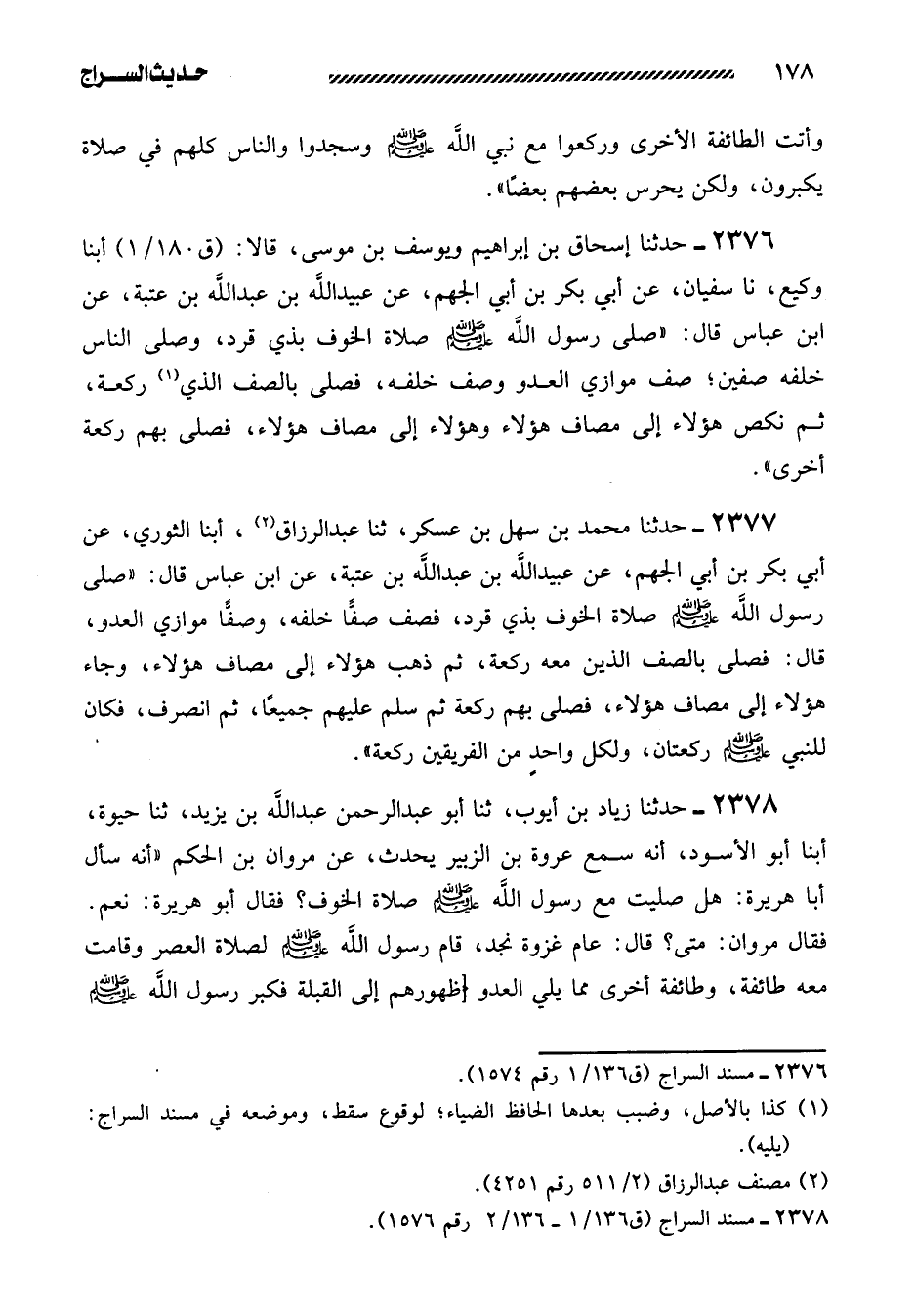 2378- حَدَّثَنَا زِيَادُ بْنُ أَيُّوبَ، ثنا أَبُو عَبْدِ الرَّحْمَنِ عَبْدُ اللَّهِ بْنُ يَزِيدَ، ثنا حَيْوَةُ، أبنا أَبُو الأَسْوَدِ، أَنَّهُ سَمِعَ عُرْوَةَ بْنَ الزُّبَيْرِ يُحَدِّثُ، عَنْ مَرْوَانَ بْنِ الْحَكَمِ ((أَنَّهُ سَأَلَ أَبَا هُرَيْرَةَ: هَلْ صَلَّيْتَ مَعَ رَسُولِ اللَّهِ صَلَّى اللَّهُ عَلَيْهِ وَسَلَّمَ صَلاةَ الْخَوْفِ؟ فَقَالَ أَبُو هُرَيْرَةَ: نَعَمْ. فَقَالَ مَرْوَانُ: مَتَى؟ قَالَ: عَامَ غَزْوَةِ نَجْدٍ، قَامَ رَسُولُ اللَّهِ صَلَّى اللَّهُ عَلَيْهِ وَسَلَّمَ لِصَلاةِ الْعَصْرِ وَقَامَتْ مَعَهُ طائفة، وطائفة أخرى مما يلي العدو [ظهورهم إلى القبلة فكبر رسول الله صلى الله عليه وسلم -[179]- وكبروا الذين معه والذين يقابلون الْعَدُوَّ] جَمِيعًا، ثُمَّ رَكَعَ رَسُولُ اللَّهِ صَلَّى اللَّهُ عَلَيْهِ وَسَلَّمَ رَكْعَةً وَاحِدَةً، وَرَكَعَ مَعَهُ الطَّائِفَةُ الَّتِي تَلِيهِ، ثُمَّ سَجَدَ وَسَجَدَتِ الطَّائِفَةُ الَّتِي تَلِيهِ، وَالآخَرُونَ قِيَامٌ مِمَّا يَلِي الْعَدُوَّ، ثُمَّ قَامَ رَسُولُ اللَّهِ صَلَّى اللَّهُ عَلَيْهِ وسلم وقامت [معه الطائفة الذين معه، فذهبوا إلى العدو فقابلوهم، وأقبلت] الطَّائِفَةُ الَّتِي كَانَتْ مُقَابِلَةَ الْعَدُوِّ، فَرَكَعُوا وَسَجَدُوا وَرَسُولُ اللَّهِ صَلَّى اللَّهُ عَلَيْهِ وَسَلَّمَ قَائِمٌ كَمَا هُوَ، ثُمَّ قَامُوا وَرَكَعَ رَسُولُ اللَّهِ صَلَّى اللَّهُ عَلَيْهِ وَسَلَّمَ رَكْعَةً أُخْرَى وَرَكَعُوا مَعَهُ، وَسَجَدَ وَسَجَدُوا مَعَهُ، ثُمَّ أَقْبَلَتِ الطَّائِفَةُ الأُخْرَى -الَّتِي كَانَتْ مُقَابِلَةَ الْعَدُوِّ- فَرَكَعُوا وَسَجَدُوا وَرَسُولُ اللَّهِ صَلَّى اللَّهُ عَلَيْهِ وَسَلَّمَ [قَاعِدٌ كما هو ثُمَّ سَلَّمَ رَسُولُ اللَّهِ صَلَّى اللَّهُ عَلَيْهِ وَسَلَّمَ] وَسَلَّمُوا جَمِيعًا، فَكَانَ لِرَسُولِ اللَّهِ صَلَّى اللَّهُ عَلَيْهِ وَسَلَّمَ رَكْعَتَيْنِ، وَلِكُلِّ رَجُلٍ مِنَ الطَّائِفَتَيْنِ (رَكْعَتَانِ رَكْعَتَانِ)) ) .