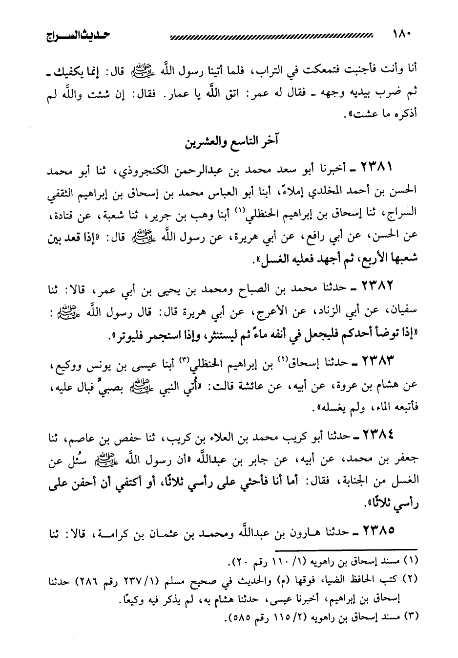 2383- حدثنا إسحاق بن إبراهيم الحنظلي أبنا عِيسَى بْنُ يُونُسَ وَوَكِيعٌ، عَنْ هِشَامِ بْنِ عُرْوَةَ، عَنْ أَبِيهِ، عَنْ عَائِشَةَ قَالَتْ: ((أُتِيَ النَّبِيَّ صَلَّى اللَّهُ عَلَيْهِ وَسَلَّمَ بِصَبِيٍّ فَبَالَ عَلَيْهِ، فَأَتْبَعَهُ الْمَاءَ، وَلَمْ يَغْسِلْهُ)) .