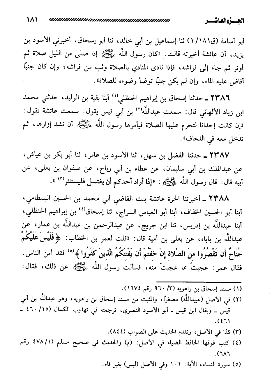 2388- أَخْبَرَتْنَا الْحُرَّةُ عَائِشَةُ بِنْتُ الْقَاضِي أَبِي مُحَمَّدِ بن الحسين البسطامي، أبنا أبو الحسين الخفاف، أبنا أبو العباس السراج، ثنا إسحاق بن إبراهيم الحنظلي، أبنا عَبْدُ اللَّهِ بْنُ إِدْرِيسَ، ثنا ابْنُ جُرَيْجٍ، عَنْ عَبْدِ الرَّحْمَنِ بْنِ عَبْدِ اللَّهِ بْنِ عَمَّارٍ، عَنْ عَبْدِ اللَّهِ بْنِ بَابَاهِ، عَنْ يعلى بن أمية قال: ((قلت لعمر بن الخطاب: {فليس عَلَيْكُمْ جُنَاحٌ أَنْ تَقْصُرُوا مِنَ الصَّلاةِ إِنْ خفتم أن يفتتنكم الذين كفروا} فَقَدْ أَمِنَ النَّاسُ. فَقَالَ عُمَرُ: عَجِبْتُ مِمَّا عجبت به، فسألت رسول الله صلى الله عليه وسلم عَنْ ذَلِكَ، فَقَالَ: -[182]- صَدَقَةٌ تَصَدَّقَ اللَّهُ عَزَّ وَجَلَّ بِهَا عَلَيْكُمْ؛ فَاقْبَلُوا صَدَقَتَهُ)) .