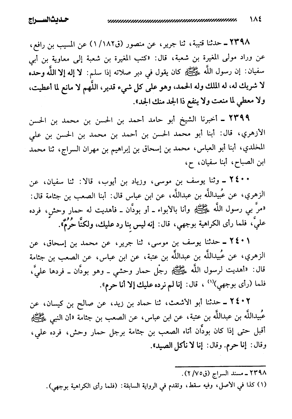 2400- وثنا يُوسُفُ بْنُ مُوسَى، وَزِيَادُ بْنُ أَيُّوبَ، قَالا: ثنا سُفْيَانُ، عَنِ الزُّهْرِيِّ، عن عبيد الله بن عبد الله، عن ابن عباس قال: أبنا الصَّعْبُ بْنُ جَثَّامَةَ قَالَ: ((مَرَّ بِي رَسُولُ اللَّهِ صَلَّى اللَّهُ عَلَيْهِ وَسَلَّمَ وَأنَا بِالأَبْوَاءِ -أَوْ بِوَدَّانَ- فَأَهْدَيْتُ لَهُ حِمَارَ وحشٍ فَرَدَّهُ عَلَيَّ، فَلَمَّا رَأَى الْكَرَاهِيَةَ بِوَجْهِي، قَالَ: أَنَّهُ لَيْسَ بِنَا رَدٌّ عَلَيْكَ، وَلَكِنَّا حرمٌ)) .