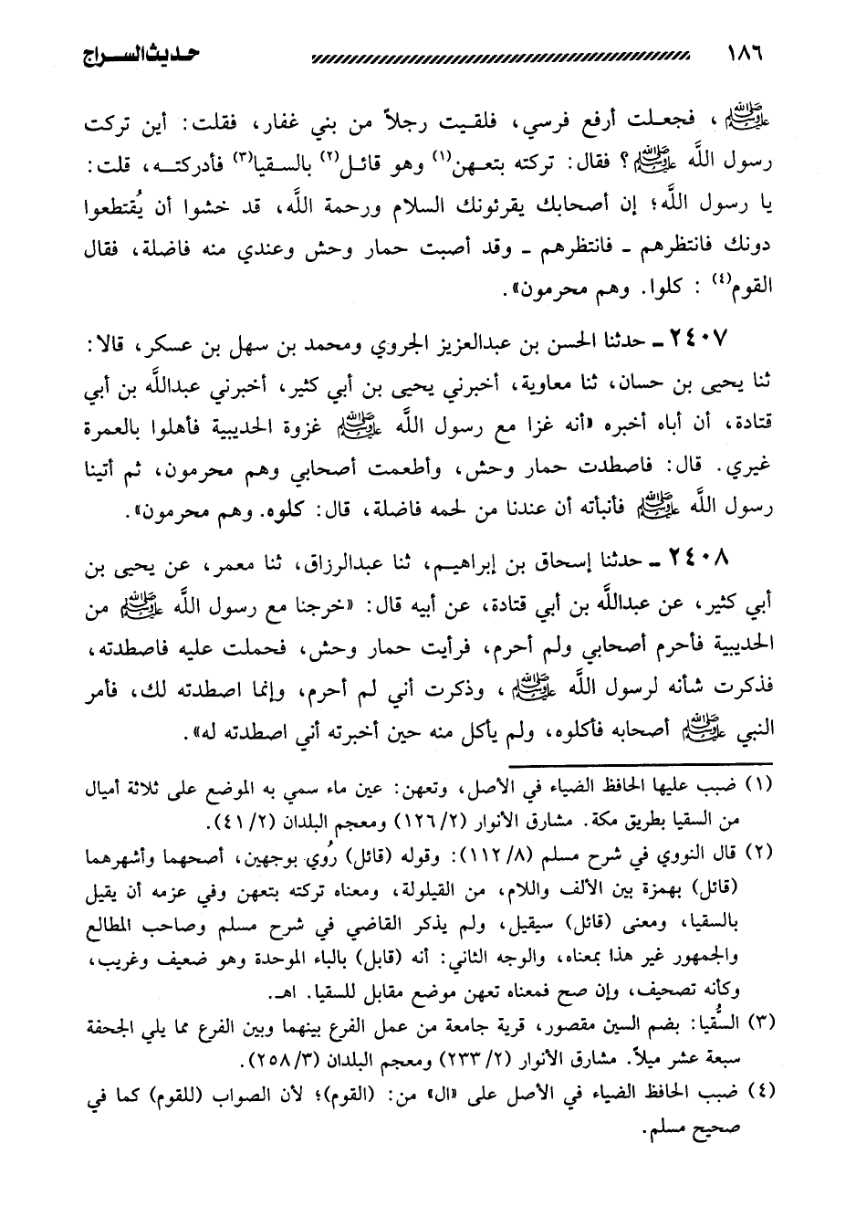 2407- حَدَّثَنَا الْحَسَنُ بْنُ عَبْدِ الْعَزِيزِ الْجَرَوِيُّ وَمُحَمَّدُ بْنُ سَهْلِ بْنِ عَسْكَرٍ، قَالا: ثنا يَحْيَى بْنُ حَسَّانٍ، ثنا مُعَاوِيَةُ، أَخْبَرَنِي يَحْيَى بْنُ أَبِي كَثِيرٍ، أَخْبَرَنِي عَبْدُ اللَّهِ بْنُ أَبِي قَتَادَةَ، أَنَّ أَبَاهُ أَخْبَرَهُ ((أَنَّهُ غَزَا مَعَ رَسُولِ اللَّهِ صَلَّى اللَّهُ عَلَيْهِ وَسَلَّمَ غَزْوَةَ الْحُدَيْبِيَةِ فَأَهَلُّوا بِالْعُمْرَةِ غَيْرِي. قَالَ: فَاصْطَدْتُ حِمَارَ وَحْشٍ، وَأَطْعَمْتُ أَصْحَابِي وَهُمْ مُحْرِمُونَ، ثُمَّ أَتَيْنَا رَسُولَ اللَّهِ صَلَّى اللَّهُ عَلَيْهِ وَسَلَّمَ فَأَنْبَأْتُهُ أَنَّ عِنْدَنَا مِنْ لَحْمِهِ فَاضِلَةً، قَالَ: كُلُوهُ. وهم محرمون)) .