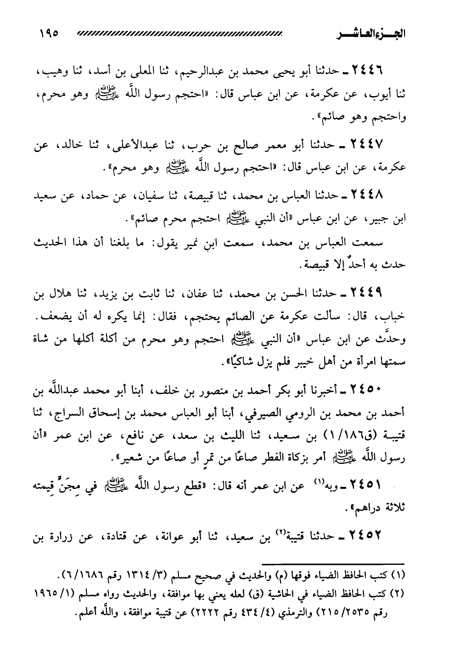2448- حَدَّثَنَا الْعَبَّاسُ بْنُ مُحَمَّدٍ، ثنا قَبِيصَةُ، ثنا سفيان، عن حماد، عن سعيد ابن جُبَيْرٍ، عَنِ ابْنِ عَبَّاسٍ ((أَنَّ النَّبِيَّ صَلَّى الله عليه وسلم احتجم مُحْرِمٌ صَائِمٌ)) .