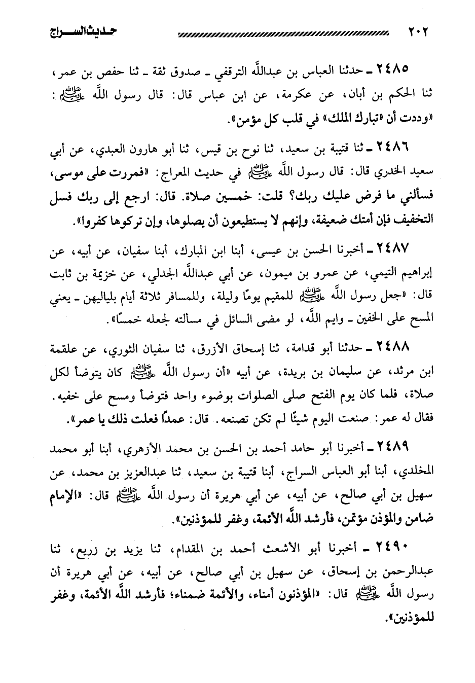 2489- أَخْبَرَنَا أَبُو حَامِدٍ أَحْمَدُ بْنُ الْحَسَنِ بْنِ محمد الأزهري، أبنا أبو محمد المخلدي، أبنا أبو العباس السراج، أبنا قتيبة بن سعيد، ثنا عبد العزيز بن مُحَمَّدٍ، عَنْ سُهَيْلِ بْنِ أَبِي صَالِحٍ، عَنْ أَبِيهِ، عَنْ أَبِي هُرَيْرَةَ أَنَّ رَسُولَ اللَّهِ صَلَّى اللَّهُ عَلَيْهِ وَسَلَّمَ قَالَ: ((الإِمَامُ ضَامِنٌ وَالْمُؤَذِّنُ مُؤْتَمَنٌ، فَأَرْشَدَ اللَّهُ الأَئِمَّةَ، وَغَفَرَ لِلْمُؤَذِّنِينَ)) .