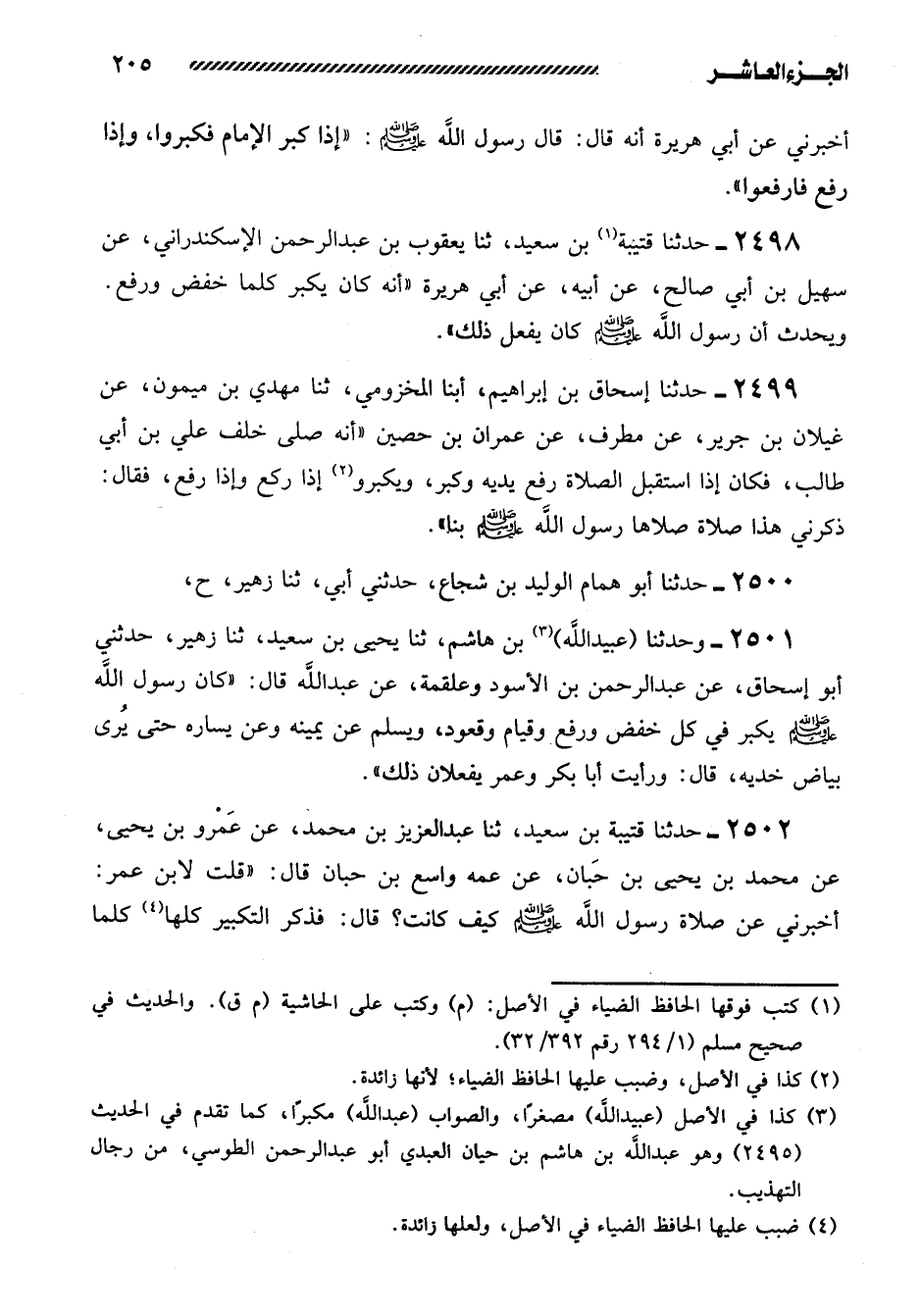2501- وحدثنا (عبيد اللَّهِ) بْنُ هَاشِمٍ، ثنا يَحْيَى بْنُ سَعِيدٍ، ثنا زُهَيْرٌ، حَدَّثَنِي أَبُو إِسْحَاقَ، عَنْ عَبْدِ الرَّحْمَنِ بْنِ الأَسْوَدِ وَعَلْقَمَةَ، عَنْ عَبْدِ اللَّهِ قال: ((كان رسول الله صلى الله عليه وَسَلَّمَ يُكَبِّرُ فِي كُلِّ خَفْضٍ وَرَفْعٍ وَقِيَامٍ وَقُعُودٍ، وَيُسَلِّمُ عَنْ يَمِينِهِ وَعَنْ يَسَارِه حَتَّى يرى بَيَاضَ خَدَّيْهِ، قَالَ: وَرَأَيْتُ أَبَا بَكْرٍ وَعُمَرَ يفعلان ذلك)) .