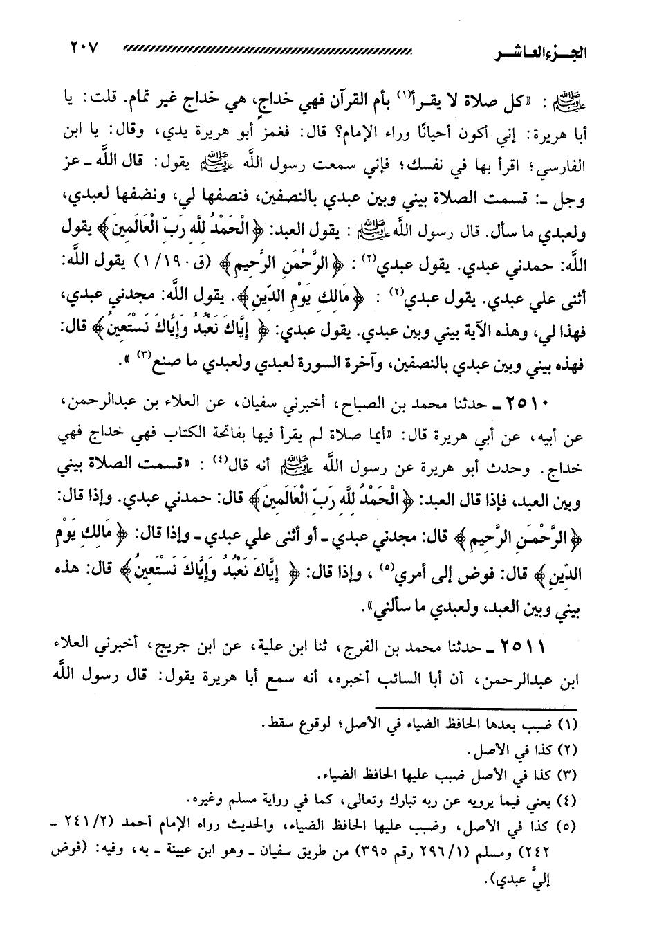 2510- حَدَّثَنَا مُحَمَّدُ بْنُ الصَّبَّاحِ، أَخْبَرَنِي سُفْيَانُ، عَنِ العلاء بن عبد الرحمن، عن أبيه، عن أَبِي هُرَيْرَةَ قَالَ: ((أَيُّمَا صَلاةٍ لَمْ يُقْرَأْ فِيهَا بِفَاتِحَةِ الْكِتَابِ فَهِيَ خِدَاجٌ فَهِيَ خِدَاجٌ. وَحَدَّثَ أَبُو هُرَيْرَةَ عَنْ رَسُولِ اللَّهِ صَلَّى اللَّهُ عَلَيْهِ وَسَلَّمَ أَنَّهُ قَالَ: ((قَسَمْتُ الصَّلاةَ بَيْنِي وَبَيْنَ الْعَبْدِ، فَإِذَا قَالَ الْعَبْدُ: {الْحَمْدُ لله رب العالمين} قَالَ: حَمِدَنِي عَبْدِي. وَإِذَا قَالَ: {الرَّحْمَنِ الرَّحِيمِ} قَالَ: مَجَّدَنِي عَبْدِي -أَوْ أَثْنَى عَلَيَّ عَبْدِي- وإذا قال: {مالك يوم الدين} . قَالَ: فَوَّضَ إِلَيَّ أَمْرِي، وَإِذَا قَالَ: {إِيَّاكَ نعبد وإياك نستعين} قَالَ: هَذِهِ بَيْنِي وَبَيْنَ الْعَبْدِ، وَلِعَبْدَيِ مَا سألني)) .