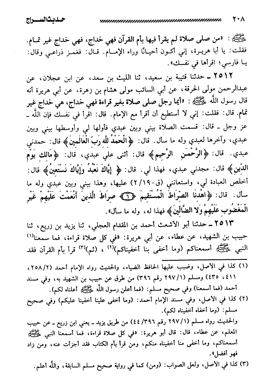 2512- حَدَّثَنَا قُتَيْبَةُ بْنُ سَعِيدٍ، ثنا اللَّيْثُ بْنُ سَعْدٍ، عَنِ ابْنِ عَجْلانَ، عَنْ عَبْدِ الرَّحْمَن مَوْلَى الْحُرَقَةِ، عَنْ أَبِي السَّائِبِ مَوْلَى هِشَامِ بْنِ زُهْرَةَ، عَنْ أَبِي هُرَيْرَةَ أَنَّهُ قَالَ رَسُولُ اللَّهِ صَلَّى اللَّهُ عَلَيْهِ وَسَلَّمَ: ((أَيُّمَا رَجُلٍ صَلَّى صَلاةً بِغَيْرِ قِرَاءَةٍ فَهِيَ خِدَاجٌ، هِيَ خِدَاجٌ غَيْرُ تَمَامٍ. قَالَ: فَقُلْتُ: إِنِّي لا أَسْتَطِيعُ أَنْ أَقْرَأَ مَعَ الإِمَامِ. قَالَ: اقْرَأْ فِي نَفسِكَ فَإِنَّ اللَّهَ -عَزَّ وَجَلَّ- قَالَ: قَسَمْتُ الصَّلاةَ بَيْنِي وَبَيْنَ عَبْدِي فَأَوَّلُهَا لِي وَأَوْسَطُهَا بَيْنِي وَبَيْنَ عَبْدِي، وَآخِرُهَا لِعَبْدِي وَلَهُ مَا سَأَلَ. قَالَ: {الْحَمْدُ لِلَّهِ رَبِّ العالمين} قال: حمدني عبدي. قال:: {الرحمن الرحيم} قَالَ: أَثْنَى عَلَيَّ عَبْدِي، قَالَ: {مَالِكِ يَوْمِ الدين} . قَالَ: مَجَّدَنِي عَبْدِي، فَهَذَا لِي، قَالَ: {إِيَّاكَ نعبد وإياك نستعين} قَالَ: أَخْلَصَ الْعِبَادَةَ لِي، وَاسْتَعَانَنِي عَلَيْهَا، وَهَذَا بَيْنِي وَبَيْنَ عَبْدِي وَلَهُ مَا سَأَلَ. قَالَ: {اهْدِنَا الصِّرَاطَ الْمُسْتَقِيمَ. صِرَاطَ الَّذِينَ أَنْعَمْتَ عَلَيْهِمْ. غير المغضوب عليهم. ولا الضالين} فَهَذَا لَهُ، وَلَهُ مَا سَأَلَ)) .