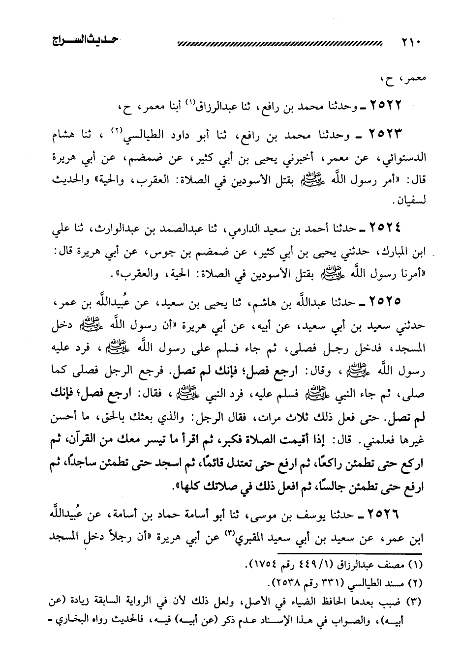 2526- حَدَّثَنَا يُوسُفُ بْنُ مُوسَى، ثنا أَبُو أُسَامَةَ حماد بن أسامة، عن عبيد الله ابن عُمَرَ، عَنْ سَعِيدِ بْنِ أَبِي سَعِيدٍ الْمَقْبُرِيِّ عَنْ أَبِي هُرَيْرَةَ ((أَنَّ رَجُلا دَخَلَ الْمَسْجِدَ -[211]- فَصَلِّي -وَرَسُولُ اللَّهِ صَلَّى اللَّهُ عَلَيْهِ وَسَلَّمَ فِي نَاحِيَةِ الْمَسْجِدِ- فَجَاءَ فَسَلَّمَ عَلَيْهِ، فَقَالَ لَهُ: وَعَلَيْكَ، ارْجِعْ فَصَلِّ؛ فَإِنَّكَ لَمْ تُصَلِّ. قَالَ: فَرَجَعَ فَصَلَّى، ثُمَّ سَلَّمَ عَلَيْهِ، فَقَالَ لَهُ: وَعَلَيْكَ ارْجِعْ فَصَلِّ؛ فَإِنَّكَ لَمْ تُصَلِّ. قَالَ: فَرَجَعَ فَصَلَّى، ثُمَّ سَلَّمَ عَلَيْهِ، فَقَالَ له: وَعَلَيْكَ فَصَلِّ؛ فَإِنَّكَ لَمْ تُصَلِّ. فَقَالَ لَهُ الرَّجُلُ فِي الثَّالِثَةِ: فَعَلِّمْنِي يَا رَسُولَ اللَّهِ. فَقَالَ: إِذَا قُمْتَ فِي الصَّلاةِ فَأَسْبِغِ الْوُضُوءَ، ثُمَّ اسْتَقْبِلِ الْقِبْلَةَ وَكَبِّرْ، ثُمَّ اقْرَأْ مَا تَيَسَّرَ مَعَكَ مِنَ الْقُرْآنِ، ثُمَّ ارْكَعْ حَتَّى تَطْمَئِنَّ رَاكِعًا، ثُمَّ ارْفَعْ رَأْسَكَ حَتَّى تَطْمَئِنَّ قَائِمًا، ثُمَّ اسْجُدْ حَتَّى تَطْمَئِنَّ سَاجِدًا، ثُمَّ ارْفَعْ حَتَّى تَسْتَوِيَ وَتَطْمَئِنَّ جَالِسًا، ثُمَّ اسْجُدْ حَتَّى -[212]- تَطْمَئِنَّ سَاجِدًا، ثُمَّ ارْفَعْ حَتَّى تَسْتَوِيَ قَائِمًا، ثُمَّ افْعَلْ ذَلِكَ فِي صَلاتِكَ كُلِّهَا)) .