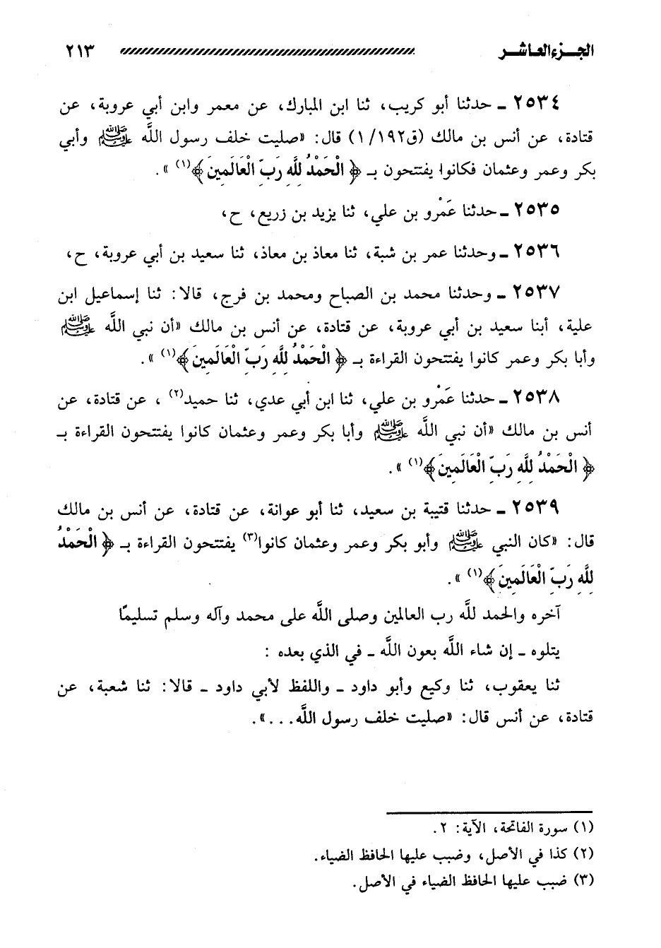 2537- وَحَدَّثَنَا مُحَمَّدُ بْنُ الصَّبَّاحِ وَمُحَمَّدُ بن فرج، قالا: ثنا إسماعيل ابن علية، أبنا سعيد بن أبي عروبة، عن قتادة، عن أنس بن مالك ((أن نبي الله صلى اللَّهُ عَلَيْهِ وَسَلَّمَ وَأَبَا بَكْرٍ وَعُمَرَ كَانُوا يَفْتَتِحُونَ الْقِرَاءَةَ بِـ {الْحَمْدُ لِلَّهِ رَبِّ الْعَالَمِينَ} )) .