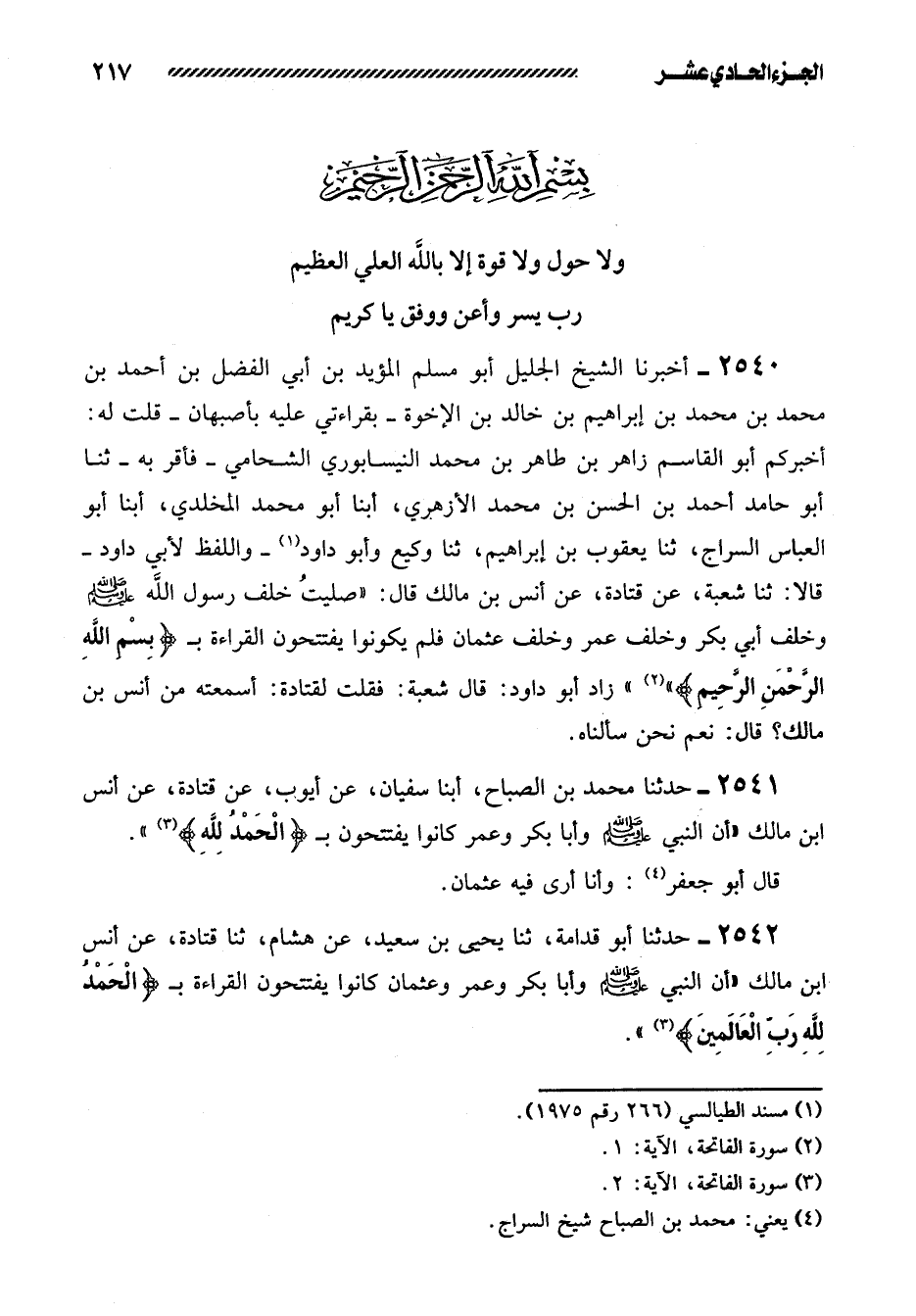 2542- حَدَّثَنَا أَبُو قُدَامَةَ، ثنا يَحْيَى بْنُ سَعِيدٍ، عن هشام، ثنا قتادة، عن أنس ابن مالك ((أن النبي صلى الله عليه وسلم وَأَبَا بَكْرٍ وَعُمَرَ وَعُثْمَانَ كَانُوا يَفْتَتِحُونَ الْقِرَاءَةَ بـ {الحمد لله رب العالمين} )) .