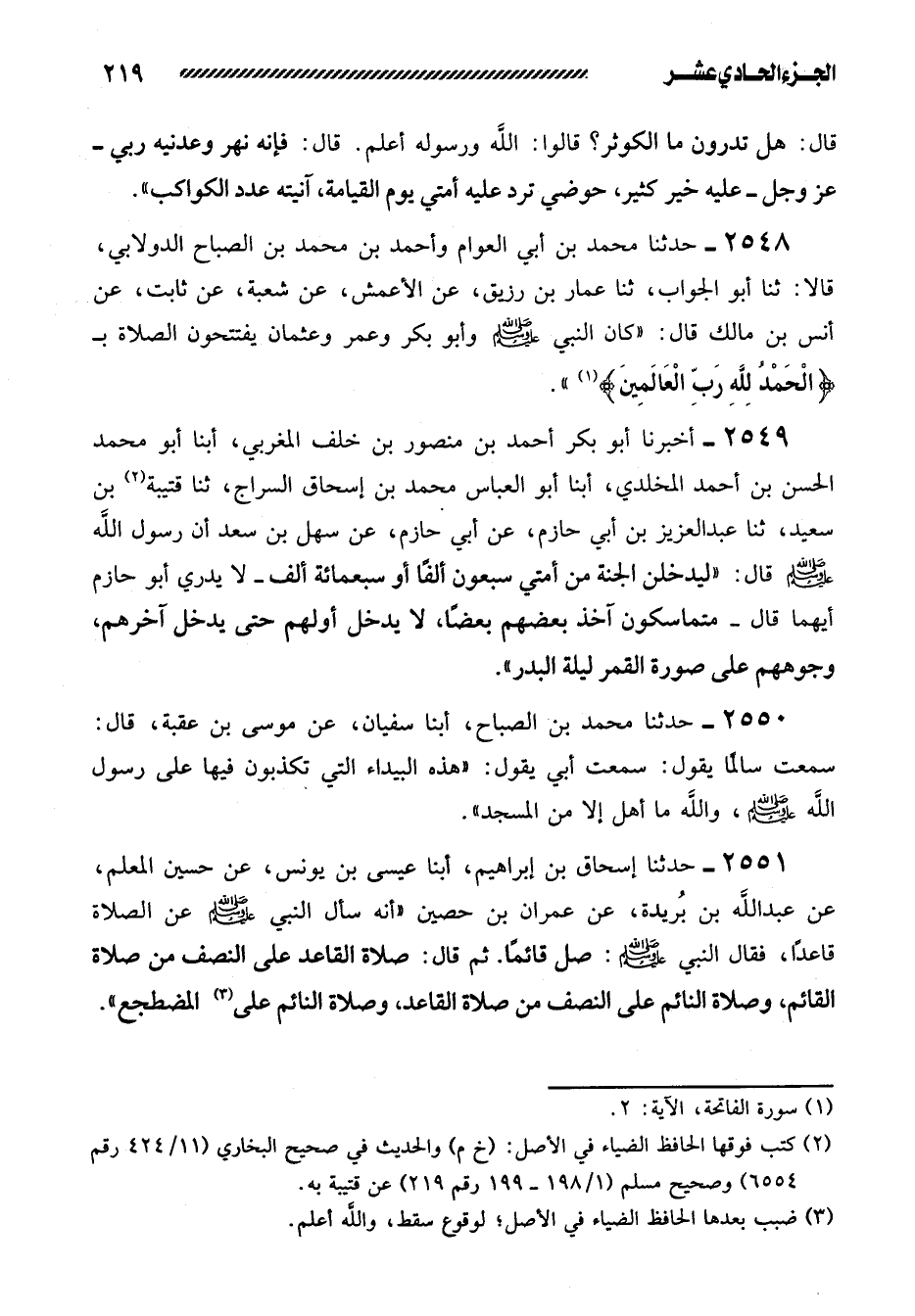 2549- أَخْبَرَنَا أَبُو بَكْرٍ أَحْمَدُ بْنُ مَنْصُورِ بْنِ خلف المغربي، أبنا أبو محمد الحسن بن أحمد المخلدي، أبنا أَبُو الْعَبَّاسِ مُحَمَّدُ بْنُ إِسْحَاقَ السَّرَّاجُ، ثنا قتيبة بن سعيد، ثنا عبد العزيز بن أبي حازم، عن أبي حازم، عن سهل بْنِ سَعْدٍ أَنَّ رَسُولَ اللَّهِ صَلَّى اللَّهُ عليه وسلم قال: ((ليدخلن الجنة من أمتي سَبْعُونَ أَلْفًا أَوْ سَبْعُمِائَةِ أَلْفٍ -لا يَدْرِي أبو حازم أيهما قال- متماسكون آخذ بعضهم بَعْضًا، لا يَدْخُلُ أَوَّلُهُمْ حَتَّى يَدْخُلَ آخِرُهُمْ، وُجُوهُهُمْ عَلَى صُورَةِ الْقَمَرِ لَيْلَةَ الْبَدْرِ)) .