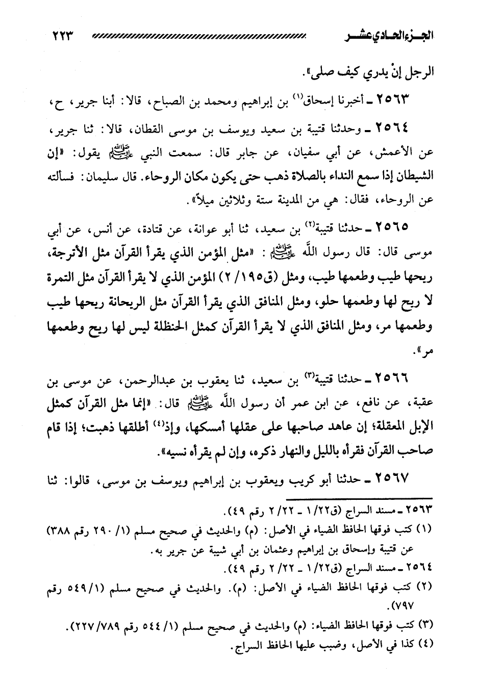2565- حدثنا قتيبة بن سعيد، ثنا أبو عوانة، عَنْ قَتَادَةَ، عَنْ أَنَسٍ، عَنْ أَبِي مُوسَى قال: قال رسول الله صلى الله عليه وَسَلَّمَ ((مَثَلُ الْمُؤْمِنِ الَّذِي يَقْرَأُ الْقُرْآنَ مَثَلُ الأُتْرُجَّةِ، رِيحُهَا طَيِّبٌ وَطَعْمُهَا طَيِّبٌ، وَمَثَلُ الْمُؤْمِنِ الَّذِي لا يَقْرَأُ الْقُرْآنَ مَثَلُ التَّمْرَةِ لا رِيحَ لَهَا وَطَعْمُهَا حُلْوٌ، وَمَثَلُ الْمُنَافِقِ الَّذِي يقرأ القرآن مثل الريحانة ريحها طيب وطعمها مُرٌّ، وَمَثَلُ الْمُنَافِقِ الَّذِي لا يَقْرَأُ الْقُرْآنَ كَمَثَلِ الْحَنْظَلَةِ لَيْسَ لَهَا رِيحٌ وَطَعْمُهَا مُرٌّ)) .
