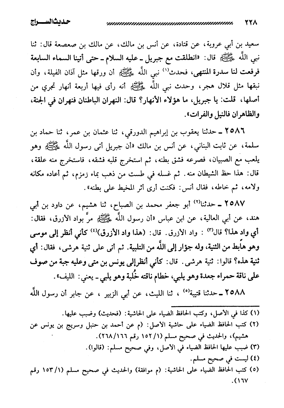 2586- حدثنا يَعْقُوبُ بْنُ إِبْرَاهِيمَ الدَّوْرَقِيُّ، ثنا عُثْمَانُ بْنُ عُمَرَ، ثنا حَمَّادُ بْنُ سَلَمَةَ، عَنْ ثَابِتٍ الْبُنَانِيِّ، عَنْ أَنَسِ بْنِ مَالِكٍ ((أَنَّ جِبْرِيلَ أَتَى رَسُولَ اللَّهِ صَلَّى اللَّهُ عَلَيْهِ وَسَلَّمَ وَهُوَ يَلْعَبُ مَعَ الصِّبْيَانِ، فَصَرَعَهُ فَشَقَّ بَطْنَهُ، ثُمَّ اسْتَخْرَجَ قَلْبَهُ فَشَقَّهُ، فَاسْتَخْرَجَ مِنْهُ عَلَقَةً، قَالَ: هَذَا حَظُّ الشَّيْطَانِ مِنْهُ. ثُمَّ غَسَلَهُ فِي طَسْتٍ مِنْ ذَهَبٍ بِمَاءِ زَمْزَمَ، ثُمَّ أَعَادَهُ مَكَانَهُ وَلأَمََهُ، ثُمَّ خَاطَهُ، فَقَالَ أَنَسٌ: فَكُنْتُ أَرَى أَثَرَ الْمِخْيَطِ عَلَى بَطْنِهِ)) .