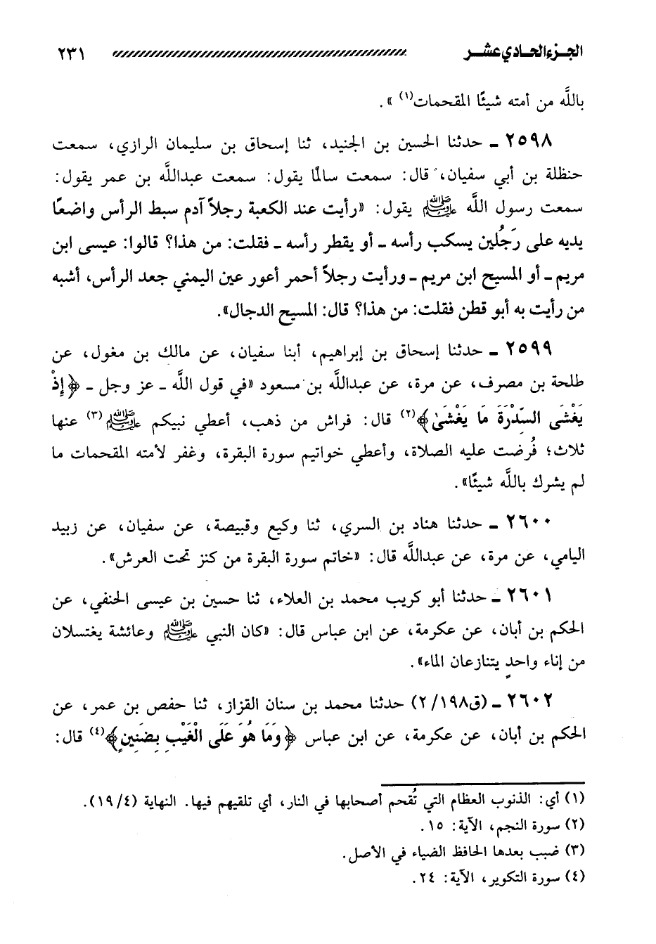 2599- حدثنا إسحاق بن إبراهيم، أبنا سُفْيَانُ، عَنْ مَالِكِ بْنِ مِغْوَلٍ، عَنْ طَلْحَةَ بْنِ مُصَرِّفٍ، عَنْ مُرَّةَ، عَنْ عَبْدِ اللَّهِ بْنِ مَسْعُودٍ ((فِي قَوْلِ اللَّهِ -عَزَّ وَجَلَّ- {إذ يغشى السدرة ما يغشى} قَالَ: فَرَاشٌ مِنْ ذَهَبٍ، أُعْطِيَ نَبِيَّكُمْ صَلَّى اللَّهُ عَلَيْهِ وَسَلَّمَ عَنْهَا ثَلاثٌ؛ فُرِضَتْ عَلَيْهِ الصَّلاةُ، وَأُعْطِيَ خَوَاتِيمُ سُورَةِ الْبَقَرَةِ، وَغُفِرَ لأُمَّتِهِ المقحمات مَا لَمْ يُشْرَكْ بِاللَّهِ شَيْئًا)) .