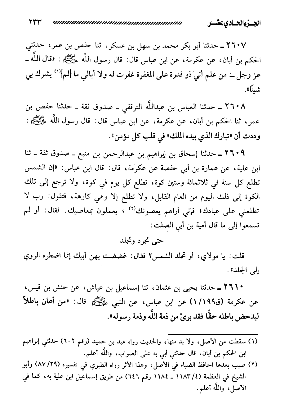 2609- حَدَّثَنَا إِسْحَاقُ بْنُ إِبْرَاهِيمَ بْنِ عَبْدِ الرَّحْمَنِ بْنِ مَنِيعٍ -صَدُوقٌ ثِقَةٌ- ثنا ابْنُ عُلَيَّةَ، عَنْ عُمَارَةَ بْنِ أَبِي حَفْصَةَ عَنْ عِكْرِمَةَ، قَالَ: قَالَ ابْنُ عَبَّاسٍ: ((إِنَّ الشَّمْسَ تَطْلُعُ كُلَّ سَنَةٍ فِي ثَلاثِمِائَةٍ وَسِتِّينَ كُوَّةً، تَطْلُعُ كل يوم في كوة، ولا تَرْجِعُ إِلَى تِلْكَ الْكُوَّةِ إِلَى ذَلِكَ الْيَوْمِ مِنَ الْعَامِ الْقَابِلِ، وَلا تَطْلُعُ إِلا وَهِيَ كَارِهَةٌ، فَتَقُولُ: رَبِّ لا تُطْلِعْنِي عَلَى عِبَادِكَ؛ فإني أراهم يعصونك؛ يعملون بمعاصيك. فقال: أو لم تسمعوا إلى ما قال أمية بن أبي الصلت: