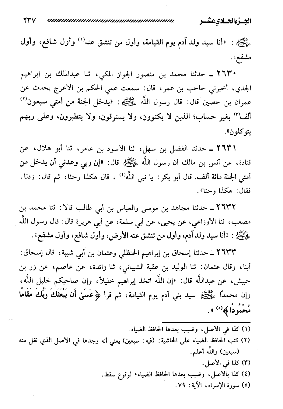 2633- حَدَّثَنَا إِسْحَاقُ بْنُ إِبْرَاهِيمَ الْحَنْظَلِيُّ وَعُثْمَانُ بْنُ أبي شيبة، قال إسحاق: أبنا، وَقَالَ عُثْمَانُ: ثنا الْوَلِيدُ بْنُ عُقْبَةَ الشَّيْبَانِيُّ، ثنا زَائِدَةُ، عَنْ عَاصِمٍ، عَنْ زِرِّ بْنِ حُبَيْشٍ، عَنْ عَبْدِ اللَّهِ قَالَ: ((إِنَّ اللَّهَ اتَّخَذَ إِبْرَاهِيمَ خَلِيلا، وَإِنَّ صَاحِبَكُمْ خَلِيلُ اللَّهِ، وَأَنَّ مُحَمَّدًا صَلَّى اللَّهُ عَلَيْهِ وَسَلَّمَ سَيِّدُ بَنِي آدَمَ يَوْمَ الْقِيَامَةِ، ثُمَّ قَرَأَ {عَسَى أن يبعثك ربك مقاماً محموداً} )) . -[238]- وهذا حديث إسحاق.