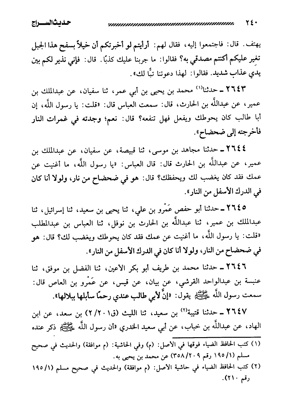 2645- حَدَّثَنَا أَبُو حَفْصٍ عَمْرُو بْنُ عَلِيٍّ، ثنا يَحْيَى بْنُ سَعِيدٍ، ثنا إِسْرَائِيلُ، ثنا عَبْدُ الْمَلِكِ بْنُ عُمَيْرٍ، ثنا عَبْدُ اللَّهِ بْنُ الْحَارِثِ بْنِ نَوْفَلٍ، ثنا الْعَبَّاسُ بْنُ عَبْدِ الْمُطَّلِبِ ((قُلْتُ: يَا رَسُولَ اللَّهِ، مَا أَغْنَيْتَ عَنْ عَمِّكَ فَقَدْ كَانَ يَحُوطُكَ وَيَغْضَبُ لَكَ؟ قَالَ: هُوَ فِي ضَحْضَاحٍ مِنَ النَّارِ، وَلَوْلا أَنَا كَانَ فِي الدَّرْكِ الأَسْفَلِ مِنَ النَّارِ)) .