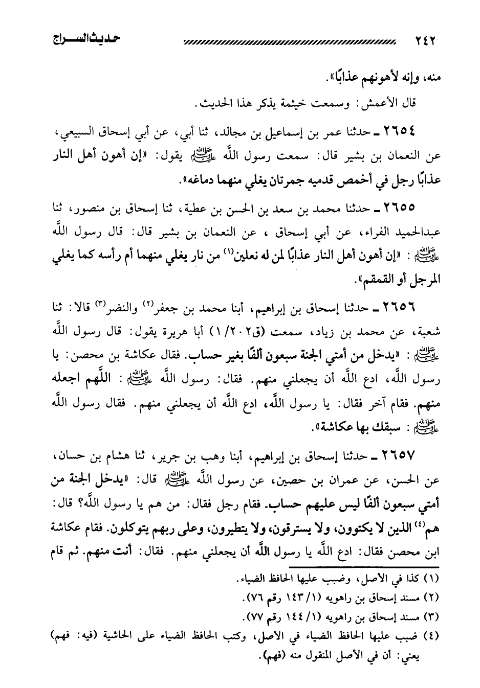 2656- حدثنا إسحاق بن إبراهيم، أبنا مُحَمَّدُ بْنُ جَعْفَرٍ وَالنَّضْرُ قَالا: ثنا شُعْبَةُ، عَنْ مُحَمَّدِ بْنِ زِيَادٍ، سَمِعْتُ أَبَا هُرَيْرَةَ يقول: قال رسول الله صلى الله عليه وَسَلَّمَ: ((يَدْخُلُ مِنْ أُمَّتِي الْجَنَّةَ سَبْعُونَ أَلْفًا بِغَيْرِ حِسَابٍ. فَقَالَ عُكَّاشَةُ بْنُ مِحْصَنٍ: يَا رَسُولَ اللَّهِ، ادْعُ اللَّهَ أَنْ يَجْعَلَنِي مِنْهُمْ. فقال: رسول الله صلى الله عليه وسلم: اللَّهُمَّ اجْعَلْهُ مِنْهُمْ. فَقَامَ آخَرُ فَقَالَ: يَا رَسُولَ اللَّهِ، ادْعُ اللَّهَ أَنْ يَجْعَلَنِي مِنْهُمْ. فقال رسول الله صلى الله عليه وسلم: سَبَقَكَ بِهَا عُكَّاشَةُ)) .