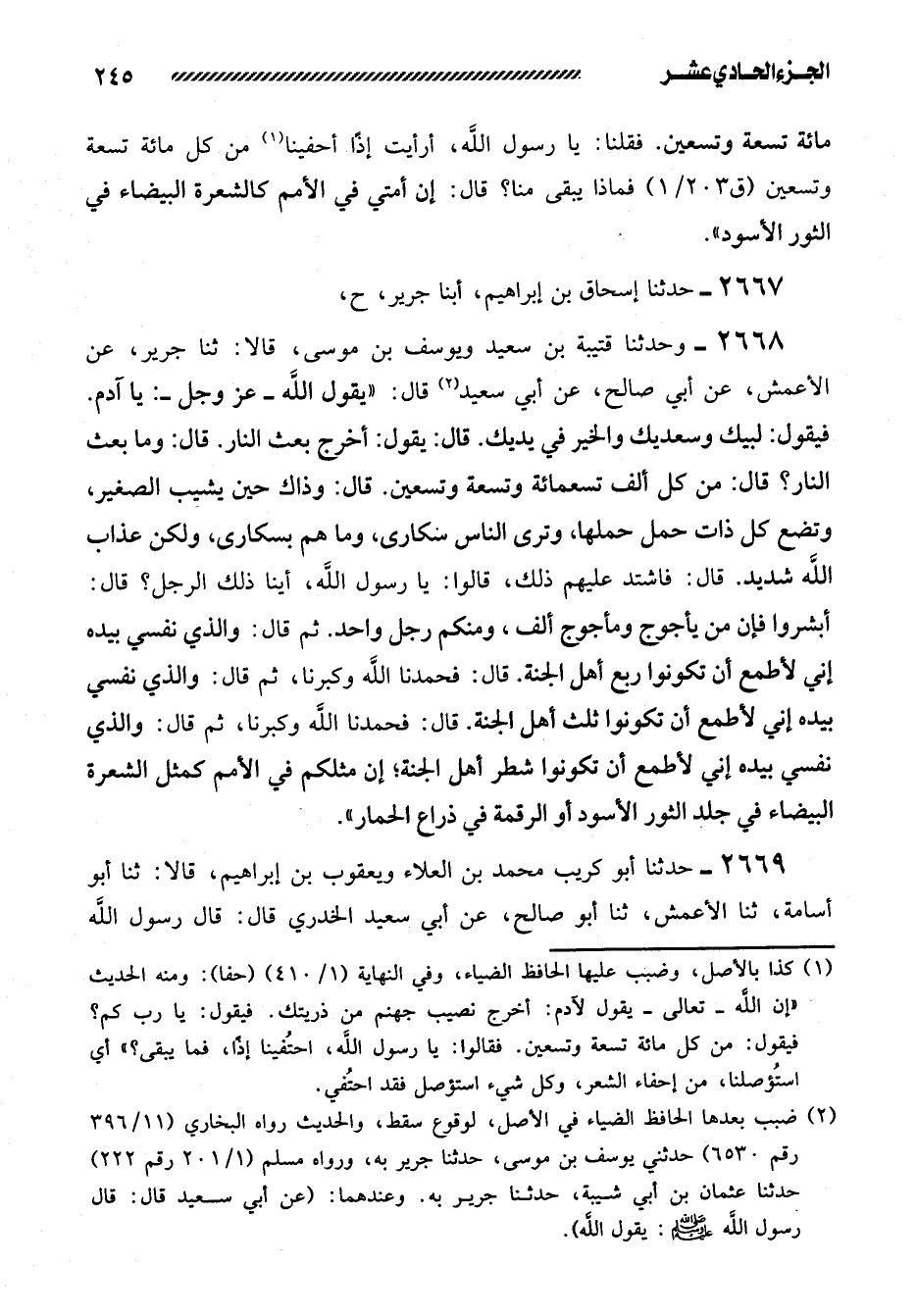 2669- حَدَّثَنَا أَبُو كُرَيْبٍ مُحَمَّدُ بْنُ الْعَلاءِ وَيَعْقُوبُ بْنُ إِبْرَاهِيمَ، قَالا: ثنا أَبُو أُسَامَةَ، ثنا الأَعْمَشُ، ثنا أَبُو صَالِحٍ، عَنْ أَبِي سَعِيدٍ الخدري قال: قال رسول الله -[246]- صلى الله عَلَيْهِ وَسَلَّمَ: ((يَقُولُ اللَّهُ -عَزَّ وَجَلَّ-: يَا آدَمُ. فَيَقُولُ: لَبَّيْكَ وَسَعْدَيْكَ وَالْخَيْرُ فِي يَدَيْكَ. قَالَ: يَقُولُ: أَخْرِجْ بَعْثَ النَّارِ. قَالَ: يَقُولُ: ربي، مَا بَعْثُ النَّارِ؟ قَالَ: مِنْ كُلِّ أَلْفٍ تِسْعَمِائَةٍ وَتِسْعِينَ. قَالَ: فَعِنْدَ ذَلِكَ يَشِيبُ الصَّغِيرُ وَتَضَعُ كُلُّ ذَاتِ حَمْلٍ حَمْلَهَا، وَتَرَى النَّاسَ سُكَارَى وَمَا هُمْ بِسُكَارَى وَلَكِنَّ عَذَابَ اللَّهِ شديد. قَالُوا: يَا رَسُولَ اللَّهِ، وَأَيُّنَا ذَلِكَ الْوَاحِدُ؟ قال: أبشروا فإن منكم رجل واحد، ومن يأجوج ومأجوج ألف. ثُمَّ قَالَ: وَالَّذِي نَفْسِي بِيَدِهِ إِنِّي لأرَجُو أَنْ تَكُونُوا رُبُعَ أَهْلِ الْجَنَّةِ. فَكَبَّرْنَا، ثُمَّ قَالَ: إِنِّي لأرَجُو أَنْ تَكُونُوا نِصْفَ أَهْلِ الْجَنَّةِ. فَكَبَّرْنَا، ثُمَّ قَالَ رَسُولُ اللَّهِ صَلَّى اللَّهُ عَلَيْهِ وَسَلَّمَ: مَا أَنْتُمْ فِي النَّاسِ إِلا كَالشَّعْرَةِ الْحَمْرَاءِ فِي جِلْدِ ثَوْرٍ أَبْيَضَ، أَوْ كَشَعْرَةٍ بَيْضَاءَ فِي جِلْدِ ثَوْرٍ أَسْوَدَ)) .