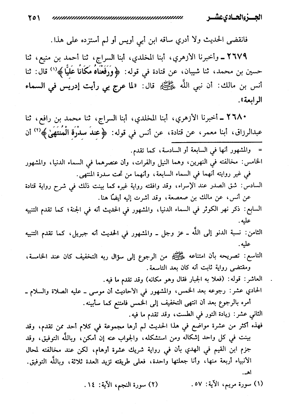 2679- وأخبرنا الأزهري، أبنا المخلدي، أبنا السراج، ثنا أَحْمَدُ بْنُ مَنِيعٍ، ثنا حُسَيْنُ بْنُ مُحَمَّدٍ، ثنا شَيْبَانُ، عَنْ قَتَادَةَ فِي قَوْلِهِ: {وَرَفَعْنَاهُ مكاناً علياً} قَالَ: ثنا أَنَسُ بْنُ مَالِكٍ: أَنَّ نَبِيَّ اللَّهِ صَلَّى اللَّهُ عَلَيْهِ وَسَلَّمَ قَالَ: ((لَمَّا عُرِجَ بِي رَأَيْتُ إِدْرِيسَ فِي السَّمَاءِ الرَّابِعَةِ)) .