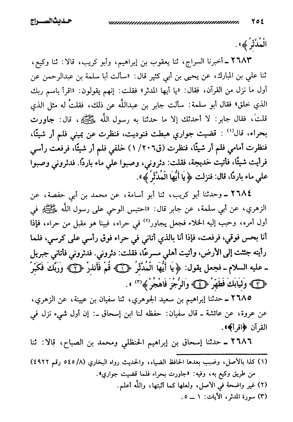 2683- أخبرنا السراج، ثنا يعقوب بن إبراهيم، وأبو كُرَيْبٍ، قَالا: ثنا وَكِيعٌ، ثنا عَلِيُّ بْنُ الْمُبَارَكِ، عَنْ يَحْيَى بْنِ أَبِي كَثِيرٍ قَالَ: ((سَأَلْتُ أَبَا سَلَمَةَ بْنَ عَبْدِ الرَّحْمَنِ عَنْ أول ما نزل من القرآن، فقال: {يا أيها المدثر} فَقُلْتُ: إِنَّهُمْ يَقُولُونَ: {اقْرَأْ بِاسْمِ رَبِّكَ الذي خلق} فَقَالَ أَبُو سَلَمَةَ: سَأَلْتُ جَابِرَ بْنَ عَبْدِ اللَّهِ عَنْ ذَلِكَ، فَقُلْتُ لَهُ مِثْلَ الَّذِي قُلْتُ، فَقَالَ جَابِرٌ: لا أُحَدِّثُكَ إِلا مَا حَدَّثَنَا بِهِ رَسُولُ اللَّهِ صَلَّى اللَّهُ عَلَيْهِ وَسَلَّمَ، قَالَ: جَاوَرْتُ بِحِرَاءٍ، قَالَ: قَضَيْتُ جِوَارِي هَبَطْتُ فَنُودِيتُ، فَنَظَرْتُ عَنْ يَمِينِي فَلَمْ أَرَ شَيْئًا، فَنَظَرْتُ أَمَامِي فَلَمْ أَرَ شَيْئًا، فَنَظَرْتُ خَلْفِي فَلَمْ أَرَ شَيْئًا، فَرَفَعْتُ رَأْسِي فَرَأَيْتُ شَيْئًا، فَأَتَيْتُ خَدِيجَةَ، فَقُلْتُ: دَثِّرُونِي، وَصُبُّوا عَلَيَّ مَاءً بَارِدًا. فَدَثَّرُونِي وَصَبُّوا عَلَيَّ مَاءً بَارِدًا، قالت: فنزلت {يا أيها المدثر} )) .