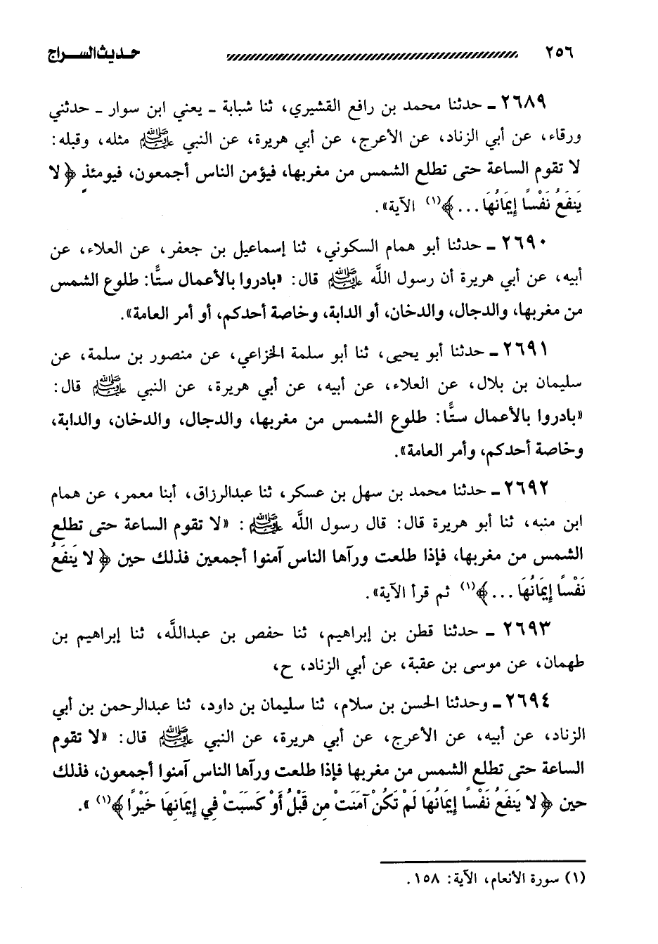 2694- وَحَدَّثَنَا الْحَسَنُ بْنُ سَلامٍ، ثنا سُلَيْمَانُ بْنُ دَاوُدَ، ثنا عَبْدُ الرَّحْمَنِ بْنُ أَبِي الزِّنَادِ، عَنْ أَبِيهِ، عَنِ الأَعْرَجِ، عَنْ أَبِي هُرَيْرَةَ، عن النبي صلى الله عليه وسلم قال: ((لا تقوم الساعة حتى تطلع الشمس من مَغْرِبِهَا فَإِذَا طَلَعَتْ وَرَآهَا النَّاسُ آمَنُوا أَجْمَعُونَ، فَذَلِكَ حِينَ {لا يَنْفَعُ نَفْسًا إِيمَانُهَا لَمْ تكن آمنت من قبل أو كسبت في إيمانها خيراً} )) .