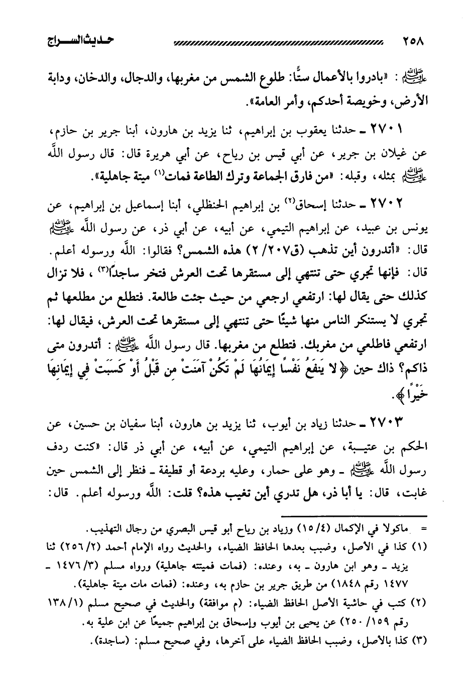 2702- حدثنا إسحاق بن إبراهيم الحنظلي، أبنا إِسْمَاعِيلُ بْنُ إِبْرَاهِيمَ، عَنْ يُونُسَ بْنِ عُبَيْدٍ، عَنْ إِبْرَاهِيمَ التَّيْمِيِّ، عَنْ أَبِيهِ، عَنْ أَبِي ذر، عن رسول الله صلى الله عليه وَسَلَّمَ قَالَ: ((أَتَدْرُونَ أَيْنَ تَذْهَبُ هَذِهِ الشَّمْسُ؟ فقالوا: اللَّهُ وَرَسُولُهُ أَعْلَمُ. قَالَ: فَإِنَّهَا تَجْرِي حَتَّى تنتهي إلى مستقرها تحت العرش فتخر ساجداً، فَلا تَزَالُ كَذَلِكَ حَتَّى يُقَالَ لَهَا: ارْتَفِعِي ارْجِعِي مِنْ حَيْثُ جِئْتِ طَالِعَةً. فَتَطْلُعُ مِنْ مَطْلَعِهَا ثُمَّ تَجْرِي لا يَسْتَنْكِرُ النَّاسُ مِنْهَا شَيْئًا حَتَّى تَنْتَهِيَ إِلَى مُسْتَقَرِّهَا تَحْتَ الْعَرْشِ، فَيُقَالُ لَهَا: ارْتَفِعِي فَاطْلُعِي مِنْ مَغْرِبِكِ. فَتَطْلُعُ مَنْ مَغْرِبِهَا. قَالَ رَسُولُ اللَّهِ صَلَّى اللَّهُ عَلَيْهِ وَسَلَّمَ: أَتَدْرُونَ مَتَى ذَاكُمْ؟ ذَاكَ حِينَ {لا ينفع نفسا إيمانها لم تكن آمنت من قبل أو كسبت في إيمانها خيرا} )) .