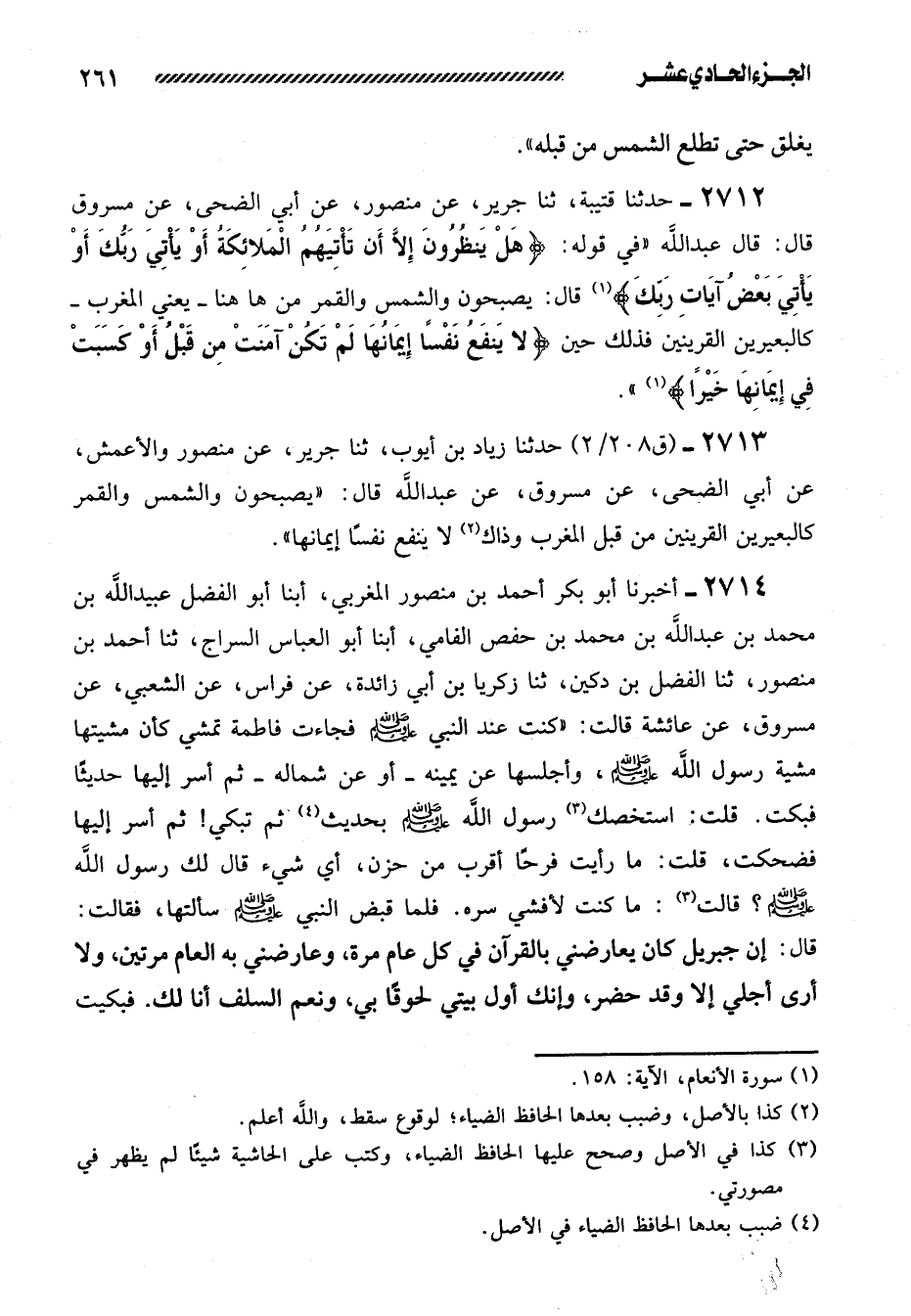 2712- حدثنا قتيبة، ثنا جرير، عن منصور، عن أَبِي الضُّحَى، عَنْ مَسْرُوقٍ قَالَ: قَالَ عَبْدُ اللَّهِ ((فِي قَوْلِهِ: {هَلْ يَنْظُرُونَ إِلا أَنْ تَأْتِيَهُمُ الْمَلائِكَةُ أَوْ يَأْتِيَ رَبُّكَ أَوْ يَأْتِيَ بعض آيات ربك} قال: يصبحون والشمس والقمر من ها هنا -يَعْنِي الْمَغْرِبَ- كَالْبَعِيرَيْنِ الْقَرِينَيْنِ فَذَلِكَ حِينَ {لا ينفع نفسا إيمانها لم تكن آمنت من قبل أو كسبت في إيمانها خيرا} .