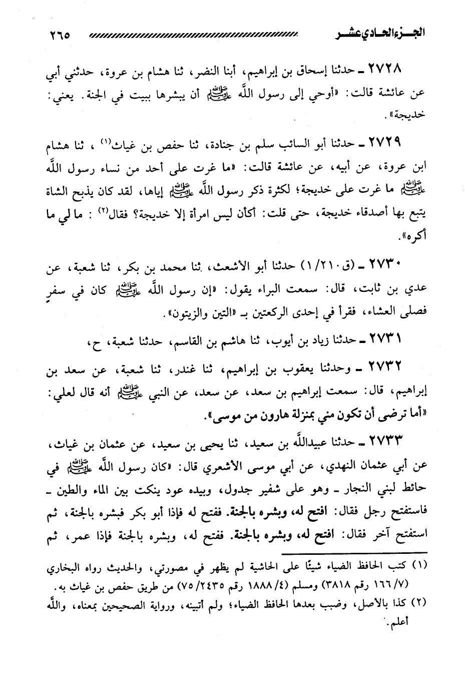 2728- حدثنا إسحاق بن إبراهيم، أبنا النَّضْرُ، ثنا هِشَامُ بْنُ عُرْوَةَ، حَدَّثَنِي أَبِي عَنْ عَائِشَةَ قَالَتْ: ((أُوحِيَ إِلَى رَسُولِ اللَّهِ صَلَّى اللَّهُ عَلَيْهِ وَسَلَّمَ أَنْ يُبَشِّرَهَا بِبَيْتٍ فِي الْجَنَّةِ. يَعْنِي: خَدِيجَةَ)) .
