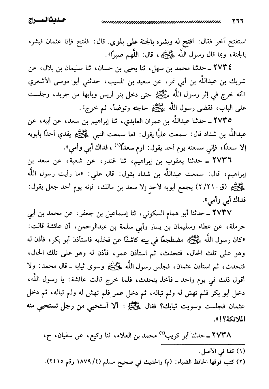 2737- حَدَّثَنَا أَبُو هَمَّامٍ السَّكُونِيُّ، ثنا إِسْمَاعِيلُ بْنُ جَعْفَرٍ، عَنْ مُحَمَّدِ بْنِ أَبِي حَرْمَلَةَ، عَنْ عَطَاءٍ وَسُلَيْمَانَ بْنِ يَسَارٍ وَأَبِي سَلَمَةَ بْنِ عَبْدِ الرَّحْمَنِ، أَنَّ عَائِشَةَ قَالَتْ: ((كَانَ رَسُولُ اللَّهِ صَلَّى اللَّهُ عَلَيْهِ وَسَلَّمَ مُضْطَجِعًا فِي بَيْتِهِ كَاشِفًا عَنْ فَخِذَيْهِ فَاسْتَأْذَنَ أَبُو بَكْرٍ، فَأَذِنَ لَهُ وَهُوَ عَلَى تِلْكَ الْحَالِ، فَتَحَدَّثَ، ثُمَّ اسْتَأْذَنَ عُمَرُ، فَأَذِنَ لَهُ وَهُوَ عَلَى تِلْكَ الْحَالِ، فَتَحَدَّثَ، ثُمَّ اسْتَأْذَنَ عُثْمَانُ، فَجَلَسَ رَسُولُ اللَّهِ صَلَّى اللَّهُ عَلَيْهِ وَسَلَّمَ وَسَوَّى ثِيَابَهُ -قَالَ مُحَمَّدٌ: وَلا أَقُولُ ذَلِكَ فِي يَوْمٍ وَاحِدٍ- فَأَخَذَ يَتَحَدَّثَ، فَلَمَّا خَرَجَ قَالَتْ عَائِشَةُ: يَا رَسُولُ اللَّهِ، دَخَلَ أَبَوُ بَكْرٍ فَلَمْ تَهُشَّ لَهُ وَلَمْ تُبَالِهِ، ثُمَّ دَخَلَ عُمَرُ فَلَمْ تَهُشَّ لَهُ وَلَمْ تُبَالِهِ، ثُمَّ دَخَلَ عُثْمَانُ فَجَلَسْتَ وَسَوَّيْتَ ثِيَابَكَ؟ فَقَالَ صَلَّى الله عليه وسلم: ألا أستحيي مِنْ رَجُلٍ تَسْتَحِي مِنْهُ الْمَلائِكَةُ؟!)) .