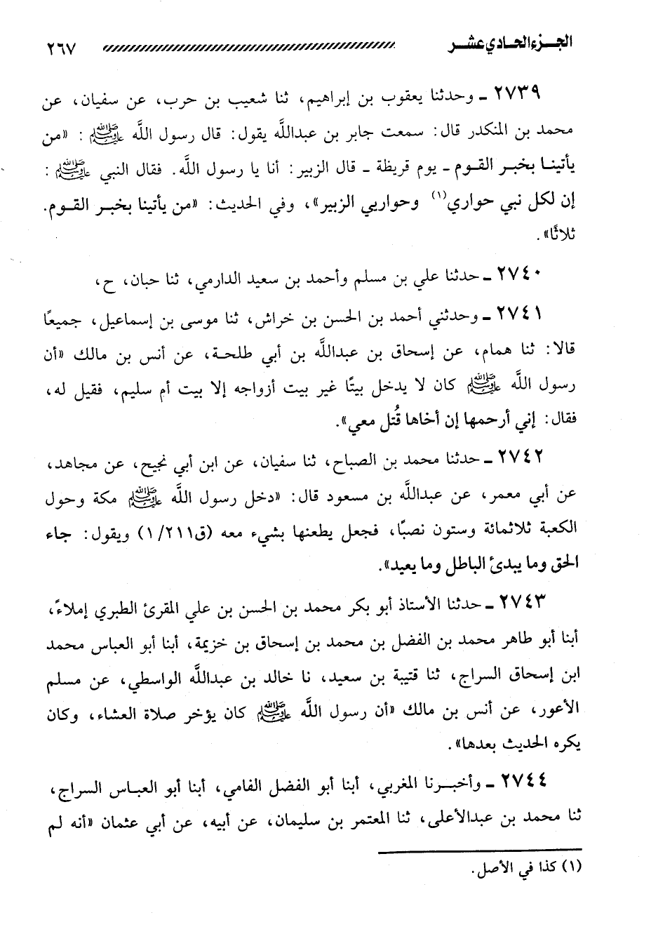 2743- حَدَّثَنَا الأُسْتَاذُ أَبُو بَكْرٍ مُحَمَّدُ بْنُ الْحَسَنِ بن علي المقرئ الطبري إملاءً، أبنا أبو طاهر محمد بن الفضل بن محمد بن إسحاق بن خزيمة، أبنا أبو العباس محمد ابن إِسْحَاقَ السَّرَّاجُ، ثنا قُتَيْبَةُ بْنُ سَعِيدٍ، نا خَالِدُ بْنُ عَبْدِ اللَّهِ الْوَاسِطِيُّ، عَنْ مُسْلِمٍ الأَعْوَرِ، عَنْ أَنَسِ بْنِ مَالِكٍ ((أَنَّ رَسُولَ الله صلى الله عليه وسلم كان يأخر صَلاةَ الْعِشَاءِ، وَكَانَ يَكْرَهُ الْحَدِيثَ بَعْدَهَا)) .