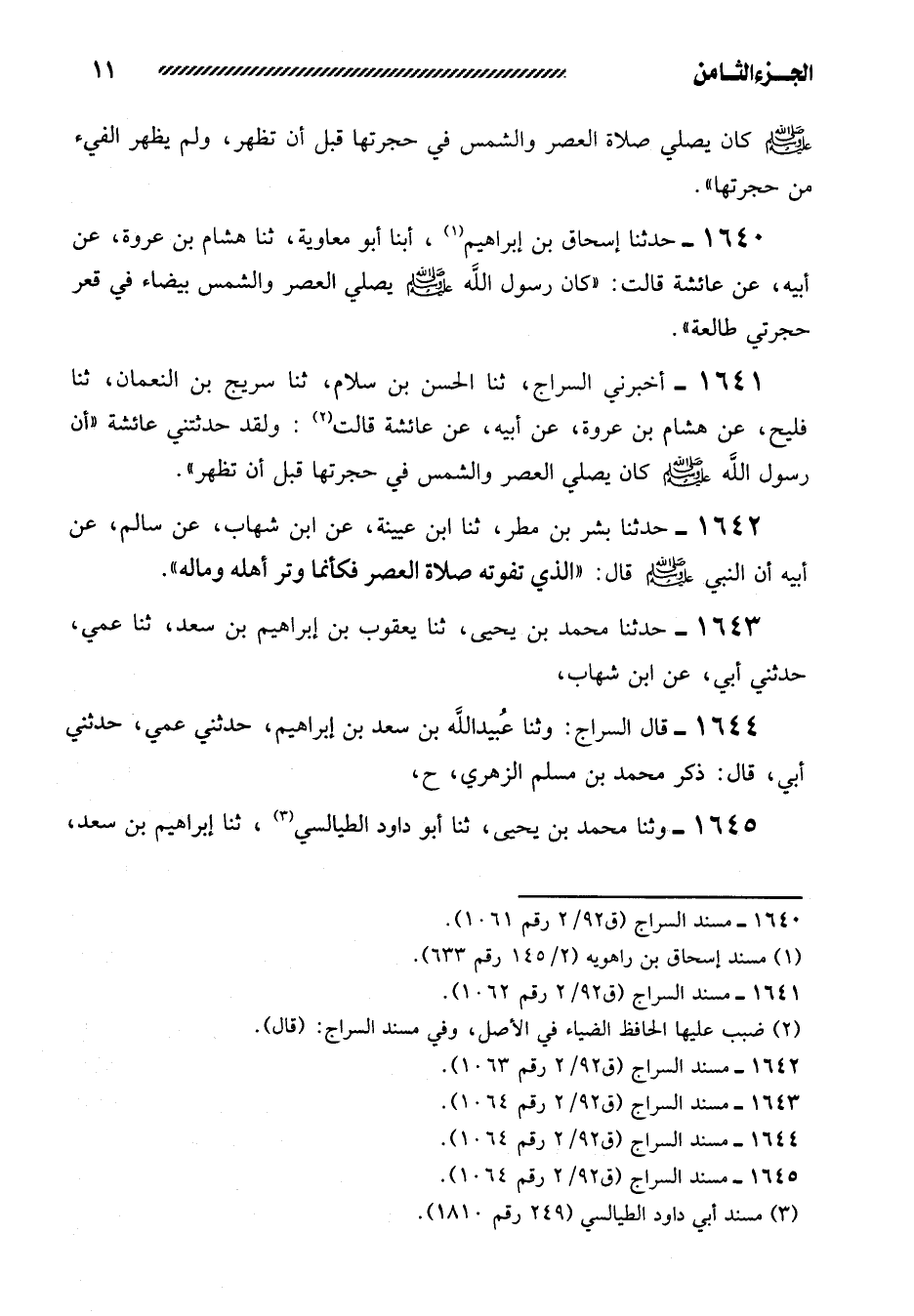 1794- حَدَّثَنَا أَبُو الأَشْعَثِ، ثنا يَزِيدُ بْنُ زُرَيْعٍ، ثنا [عمر] بن محمد بن فلان ابن [عَبْدِ اللَّهِ] بْنِ عُمَرَ، حَدَّثَنِي حَفْصُ بْنُ عَاصِمٍ قَالَ: ((اشْتَكَيْتُ فَجَاءَنِي ابْنُ عُمَرَ يَعُودُنِي، فَقُلْتُ: يَا أَبَا عَبْدِ الرَّحْمَنِ، مَا يَمْنَعُكَ فِي السُّبْحَةِ فِي السَّفَرِ؟ قَالَ: لَوْ كُنْتُ مُسَبِّحًا فِي السَّفَرِ لأَتْمَمْتُ الصَّلاةَ، صَحِبْتُ رَسُولَ اللَّهِ صَلَّى اللَّهُ عَلَيهِ وَسَلَّمَ فَلَمْ أَرَهُ مُسَبِّحًا فِي السَّفَرِ، وَقَالَ اللَّهُ -تَعَالَى-: {لَقَدْ كَانَ لَكُمْ فِي رَسُولِ اللَّهِ أسوةٌ حسنةٌ لمن كان يرجو الله واليوم الآخر} وَإِنَّ أَعْجَزَ النَّاسِ مَا لَمْ يَأْخُذْ بِرُخَصِ اللَّهِ -عَزَّ وَجَلَّ-)) .