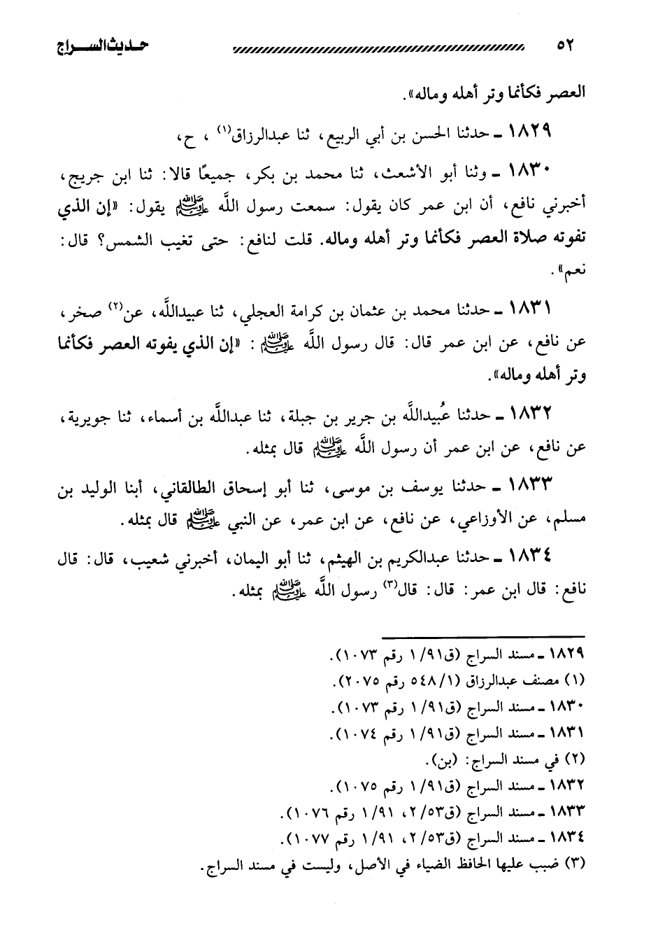 1831- حدثنا مُحَمَّدُ بْنُ عُثْمَانَ بْنِ كَرَامَةَ الْعِجْلِيُّ، ثنا عُبَيْدُ اللَّهِ، عَنْ صَخْرٍ، عَنْ نَافِعٍ، عَنِ ابن عمر قال: قال رسول الله صلى اللَّهُ عَلَيهِ وَسَلَّمَ: ((إِنَّ الَّذِي يَفُوتُهُ الْعَصْرُ فَكَأَنَّمَا وُتِرَ أَهْلَهُ وَمَالَهُ)) .